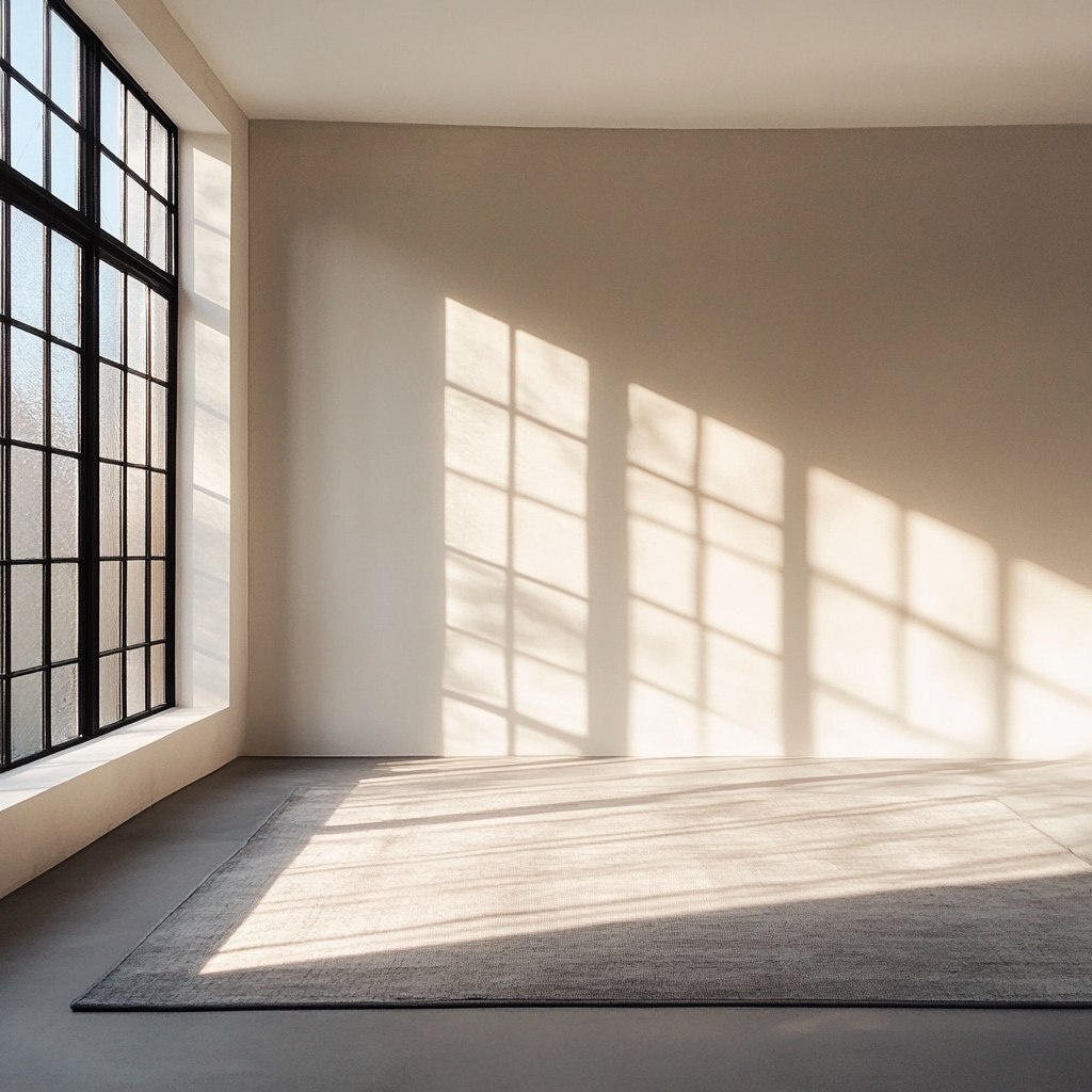 Создано на основе запроса: empty room, wall is off white beige, the flooring is full rug wich is grey, windows are black, sunshine shadows
