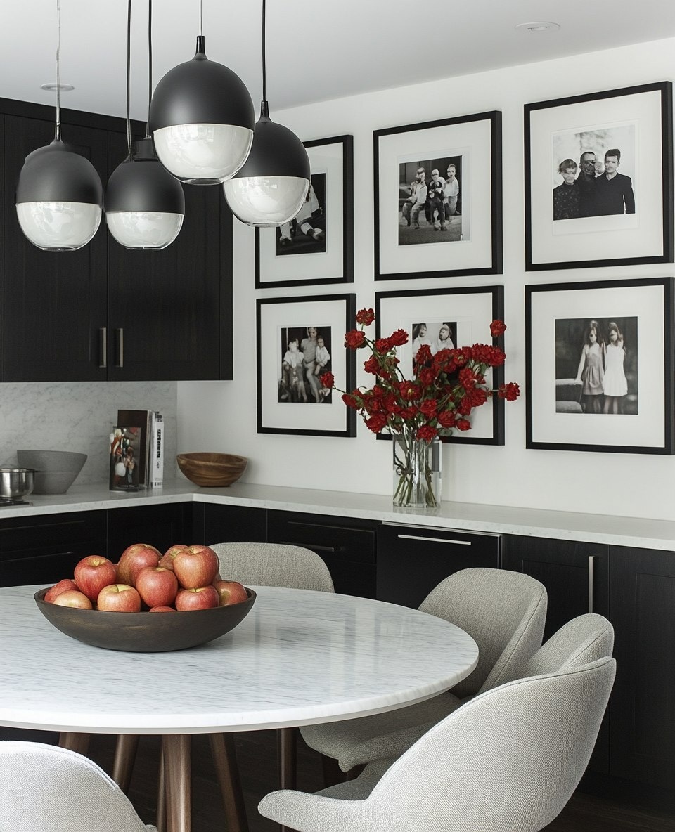 Создано на основе запроса: A modern kitchen with black cabinets, white walls, and large picture frames on the wall above a round dining
