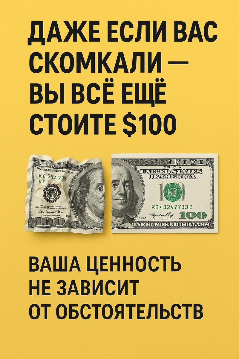 Вы бы взяли сто долларов, если бы вам их предложили? А если бы их перед этим скомкали, бросили на пол и наступили грязным ботинком? Скорее всего, вы всё равно бы взяли. Потому что это по-прежнему $100. Потому что ценность купюры не зависит от того, через что она прошла. Такой эксперимент провёл один профессор, и его смысл оказался глубже, чем может показаться. ⸻ «Ты всё равно ценен» — звучит просто. Но в жизни мы об этом забываем Мы выгораем на работе. Получаем отказ. Нас критикуют. Кто-то говорит, что мы “неподходящие”, “слишком странные”, “не в формате”. И кажется — с нами что-то не так. Что мы “скомканы”. Что нас “испортили”. Что мы уже не заслуживаем чего-то лучшего. Но правда в том, что наша ценность не исчезает от мнения других. И не зависит от обстоятельств. ⸻ Но есть нюанс, о котором редко говорят Пару лет назад блогер в ОАЭ сделал похожий эксперимент с местными купюрами — и попал за это в тюрьму. Оказалось, что манипуляции с деньгами там могут быть расценены как оскорбление св