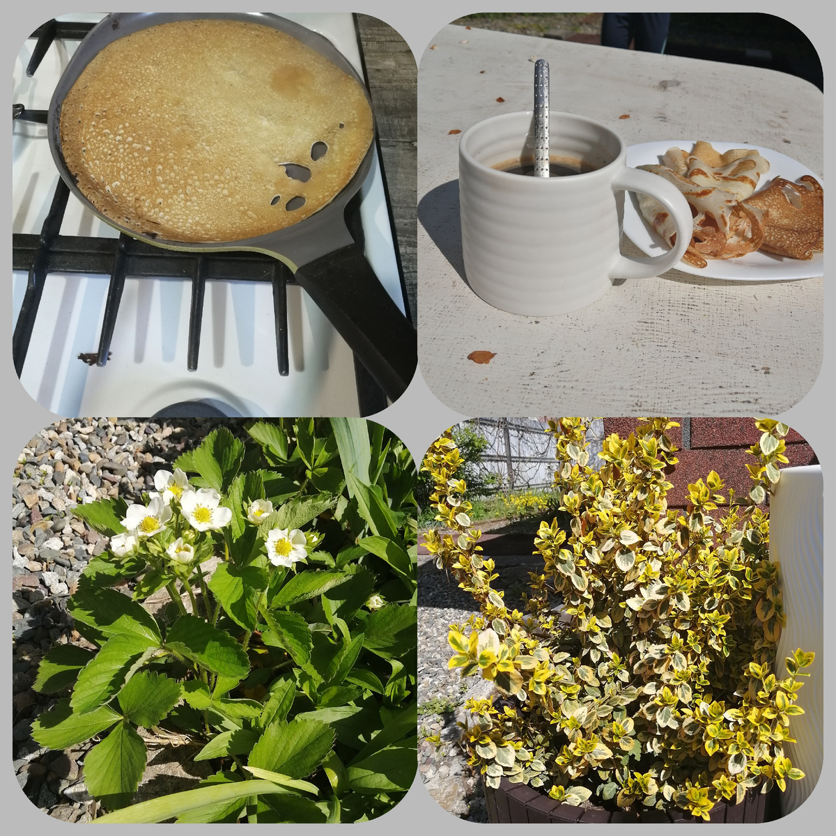 Провели отличное утро во дворе с кофейком и блинчиками, слушали как чирикают птички, жужжат пчелки, любовались цветущей клубникой и муравьями.