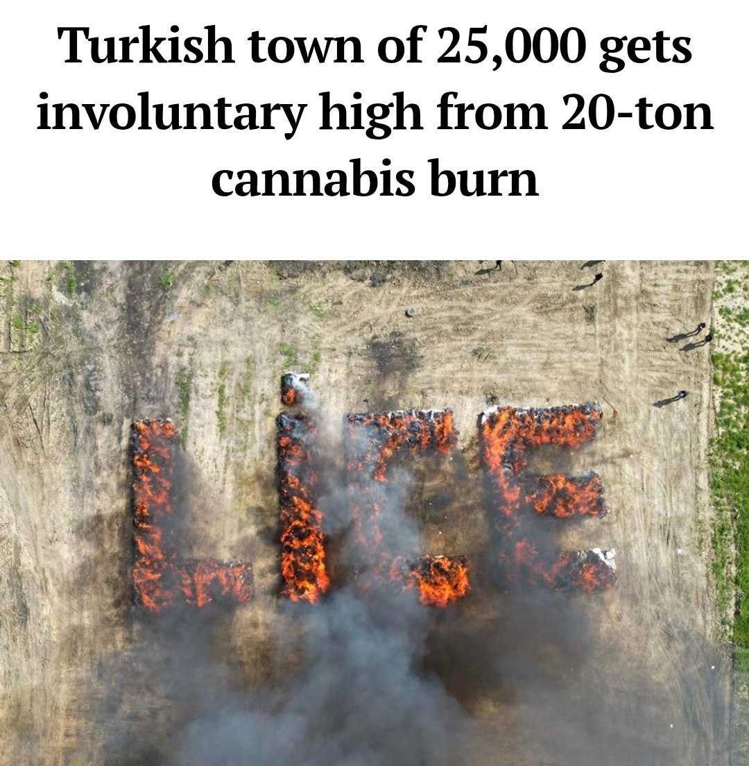 В Турции полиция устроила 5-дневный марафон эйфории для целого города. В Лидже жгли 20 тонн марихуаны — дым унесло в жилые кварталы. Под кайф случайно попали 25 тысяч человек. Жалоб — ноль. Город был счастлив, полиция — нет.