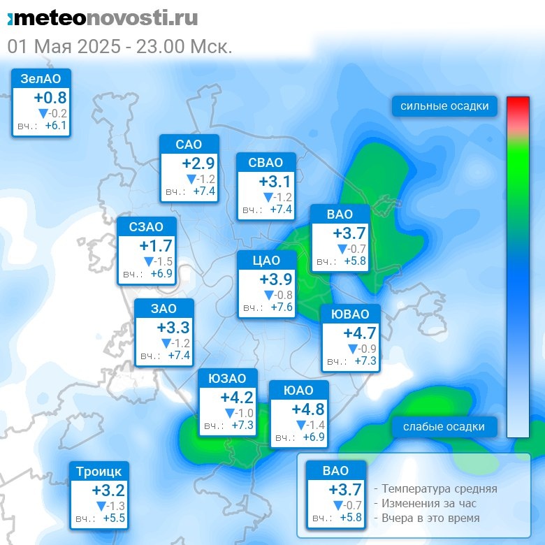 В 23:00 в Москве было от +0.7°C до +5.3°C, средняя температура +3.4°C #погода #Москва #весна #температура #1мая #четверг