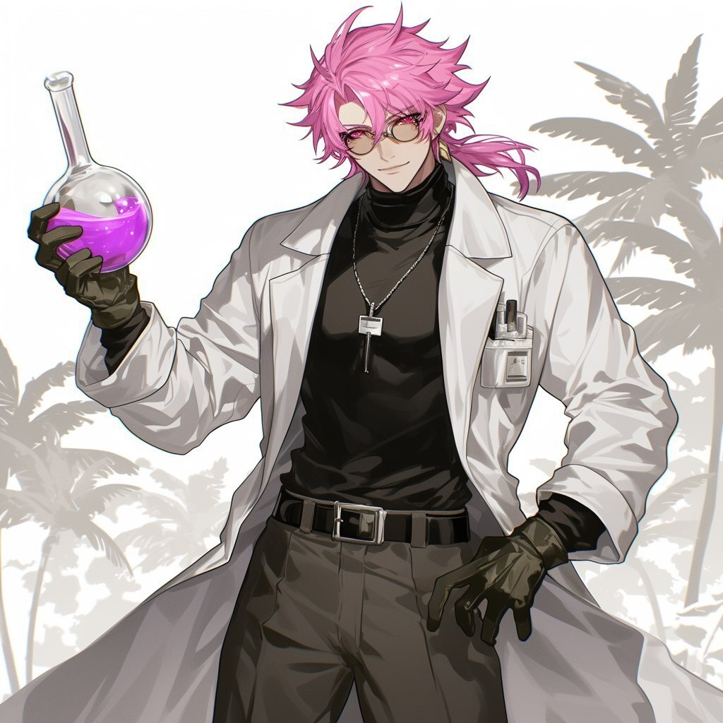 Создано на основе запроса: Full-length portrait of a scientist guy with coral hair and scarlet eyes holding a flask with liquid on a