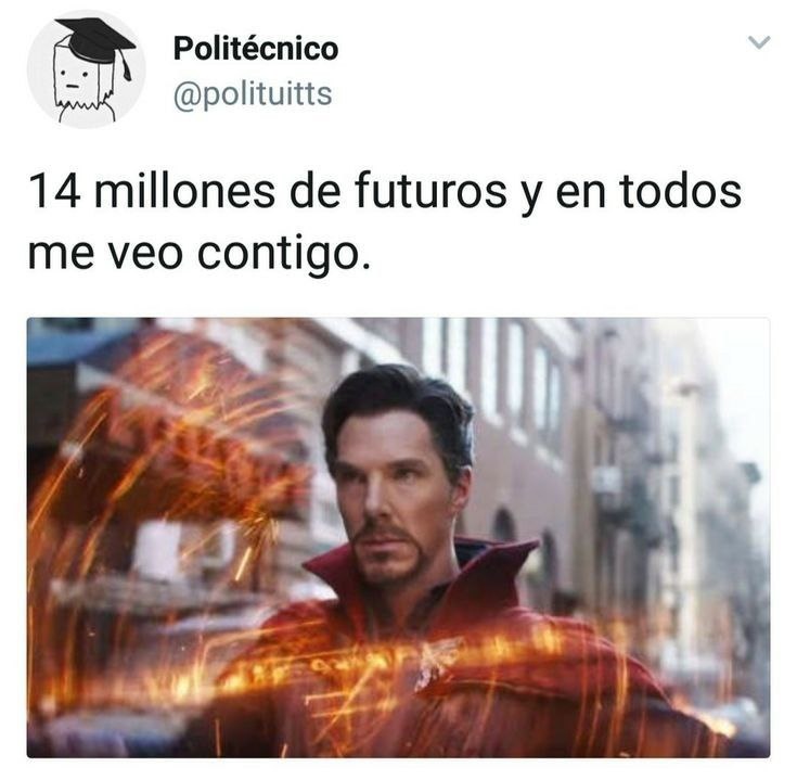 🥷 ʟᴏs ᴠᴇɴɢᴀᴅᴏʀᴇs - Мстители 🥰 ᴠᴇʀsᴇ (con alguien) - представлять/видеть себя (зд. с кем-л...) ❤️ traducción: Я посмотрел 14000605 вариантов будущего, и в каждом из них я вижу нас вместе. #дляподката #дляважных #ligue #amor #series #A2 ➡#contexto: Переделка фразы доктора Стрэнджа из Vengadores: Infinity war 🟥Мстители: Война бесконечности 🟥