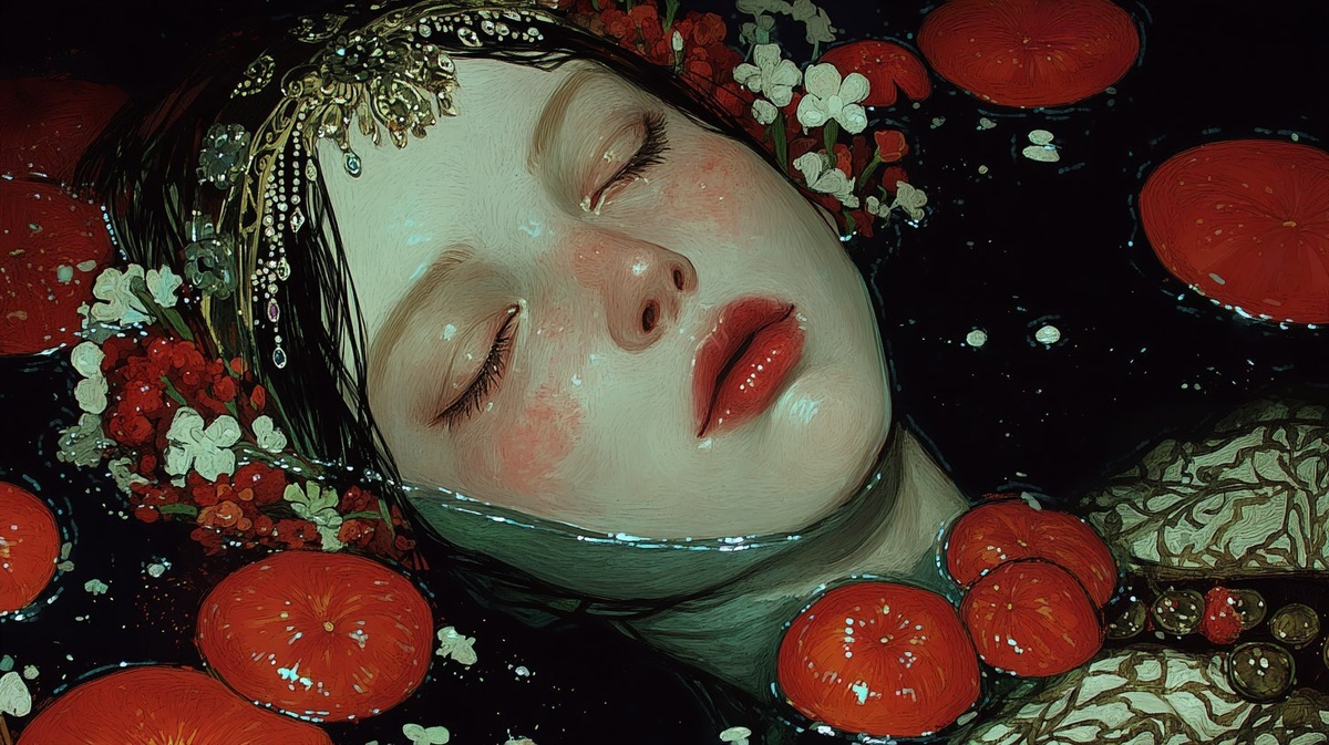 Создано на основе запроса: lycoris flowerpunk forced perspective burlesque Fellini Satyricon 1969 , Ophelia floating underwater and dressed in flowers and lycoris, John Everett Millais Ophelia Painting, dressed in flowers and lycoris, in the artgerm style, loose line work, luxurious and detailed, cottagecore, inspired by nature and lycoris, by Zdzisław Beksiński and klimt and hans bellmer and odd nerdrum, photographed, photogenic, authentic, cinematic, dressed in flowers and lycoris, luxurious and detailed, detailed facial features, cottagecore, nature-inspired,