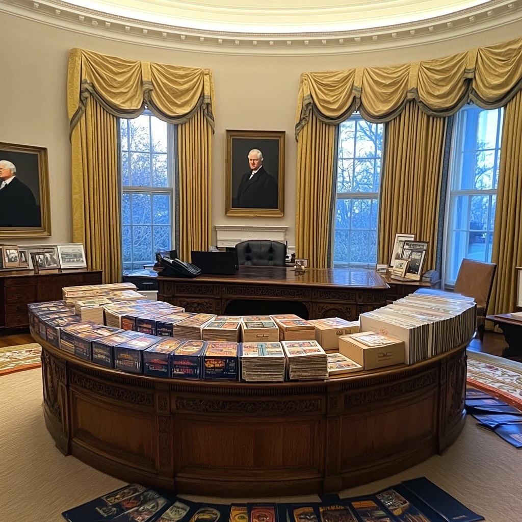 Создано на основе запроса: a realistic front facing empty oval office with boxes of vintage sports cards on the floor
