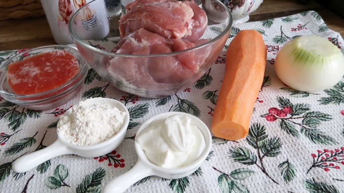 В этом рецепте нет ничего сверхъестественного, самые простые ингредиенты, которые всегда, или почти всегда есть в доме, так что вкусного обеда/ужина точно не избежать. А понадобится нам вот что: 🔸Филе бедра индейки - 450 г. 🔸Морковь - 1 шт. 🔸Репчатый лук - 1 шт. 🔸Мука - 1 ст.л. 🔸Сметана - 1 ст.л. 🔸Стакан горячей воды 🔸Томатная паста - 1 ст.л. 🔸Соль и чёрный перец по вкусу Мясо индейки нарезать на небольшие полоски, затем отправить всё на разогретую сковороду и обжарить до появления сока примерно 3 минуты. Мясо перемешать, накрыть крышкой и потушить еще примерно 10 минут. В это время займёмся овощами. Лук необходимо мелко нарезать, а морковь натереть на крупной терке. Как раз за это время мясо хорошо обжарилось. Теперь нужно овощи добавить к индейке и потушить все вместе до приятного аромата. Присыпать блюдо мукой, посолить, поперчить. Всё хорошо перемешать и добавить томатную пасту. У меня вместо томатной пасты используется замороженный томат, в нем уже есть