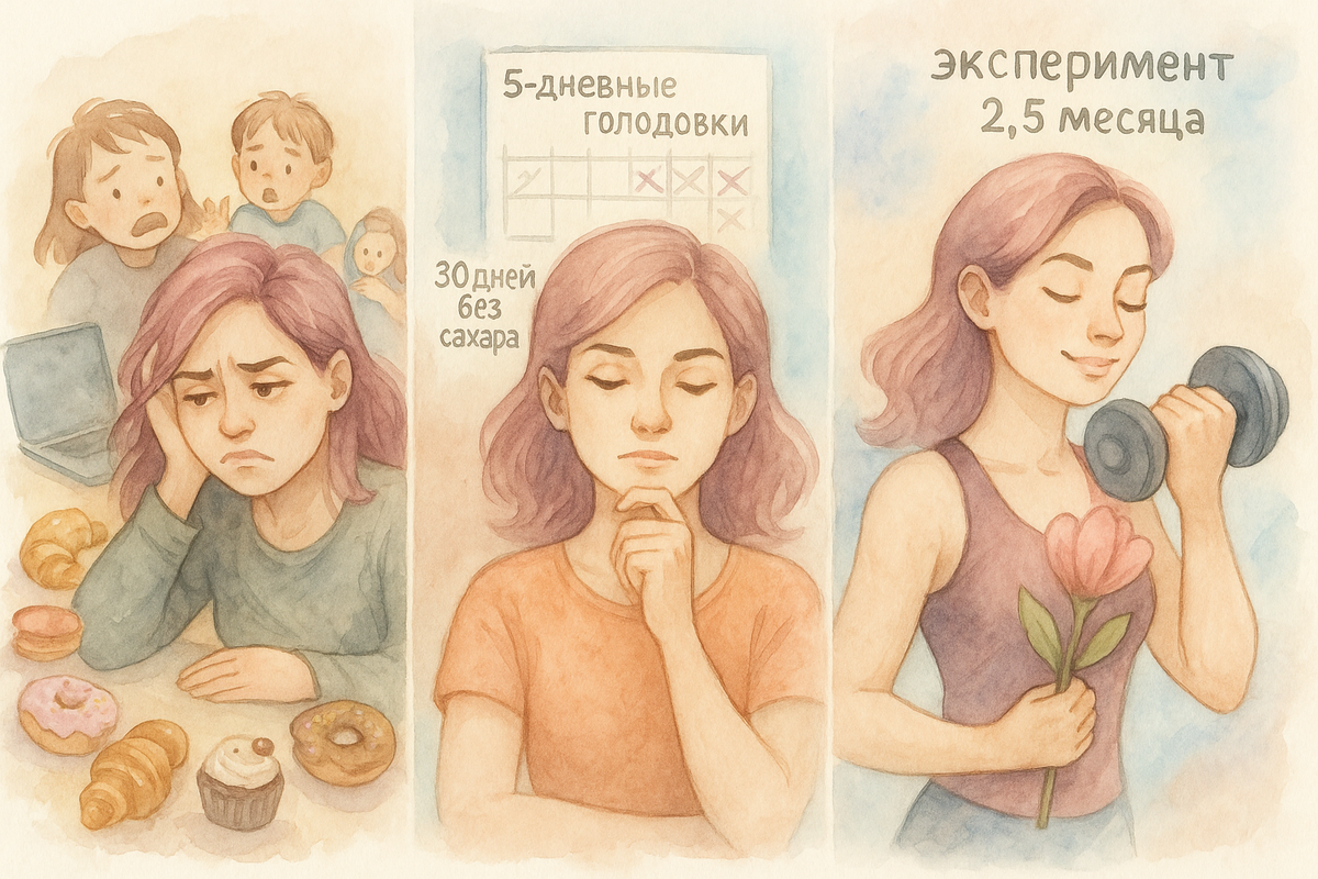 Вот уже 2 года я пытаюсь вернуться к активной физической форме. Получается с переменным успехом: начинаю активно заниматься спортом и следить за питанием, затем срываюсь — и цикл повторяется заново. Психологически это очень тяжело. Постоянный стресс, работа, дети, усталость — и конечно, рядом кто-то всегда ест вкусняшки, на которые неимоверно сложно не соблазниться. Голодание до 5 дней