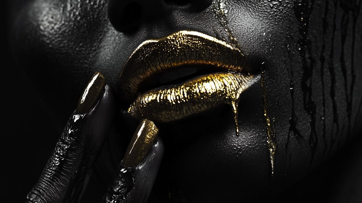 Создано на основе запроса: close-up of a woman's face and hand in grayscale, dripping metallic gold paint on lips and fingers, ultra realistic texture, glossy skin, high contrast black and gold, fashion editorial photography style, elegant and dramatic lighting, modern luxury wall art aesthetic