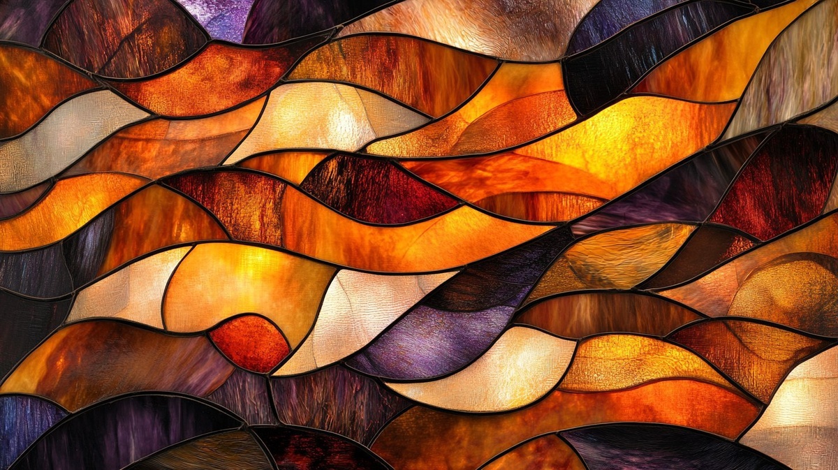 Создано на основе запроса: abstract stained glass mosaic, flowing shapes and organic pattern, warm color palette of orange, gold, brown, and