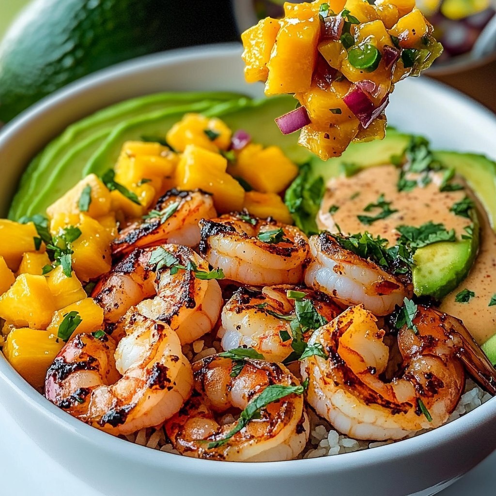 Создано на основе запроса: | Title: Shrimp and Avocado Bowls with Mango Salsa & Lime-Chili Sauce | Close-up Shot right view, taken by a