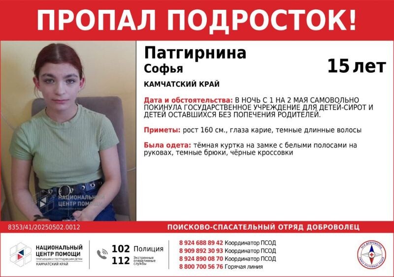 📌 На Камчатке пропали подростки На полуострове разыскивают двух воспитанников детского дома, сообщает агентство «КАМЧАТКА-ИНФОРМ» со ссылкой на поисково-спасательный отряд «Доброволец». Жителей Камчатки просят помочь установить местонахождение 15-летней Софьи Патгирниной и 17-летнего Никиты Воскресенского. В ночь с 1 на 2 мая они самовольно ушли из детского дома для детей-сирот и детей, оставшихся без попечения родителей. С тех пор о подростках ничего не известно. Всех, кто обладает какой-либо информацией о том, где могут быть пропавшие дети, просят звонить на единый номер экстренных служб 112, в полицию 102 или координатору поисково-спасательного отряда «Доброволец» по телефону 8-924-688-8942. Читать на сайте: https://kamchatinfo.com/news/incidents/detail/69826/
