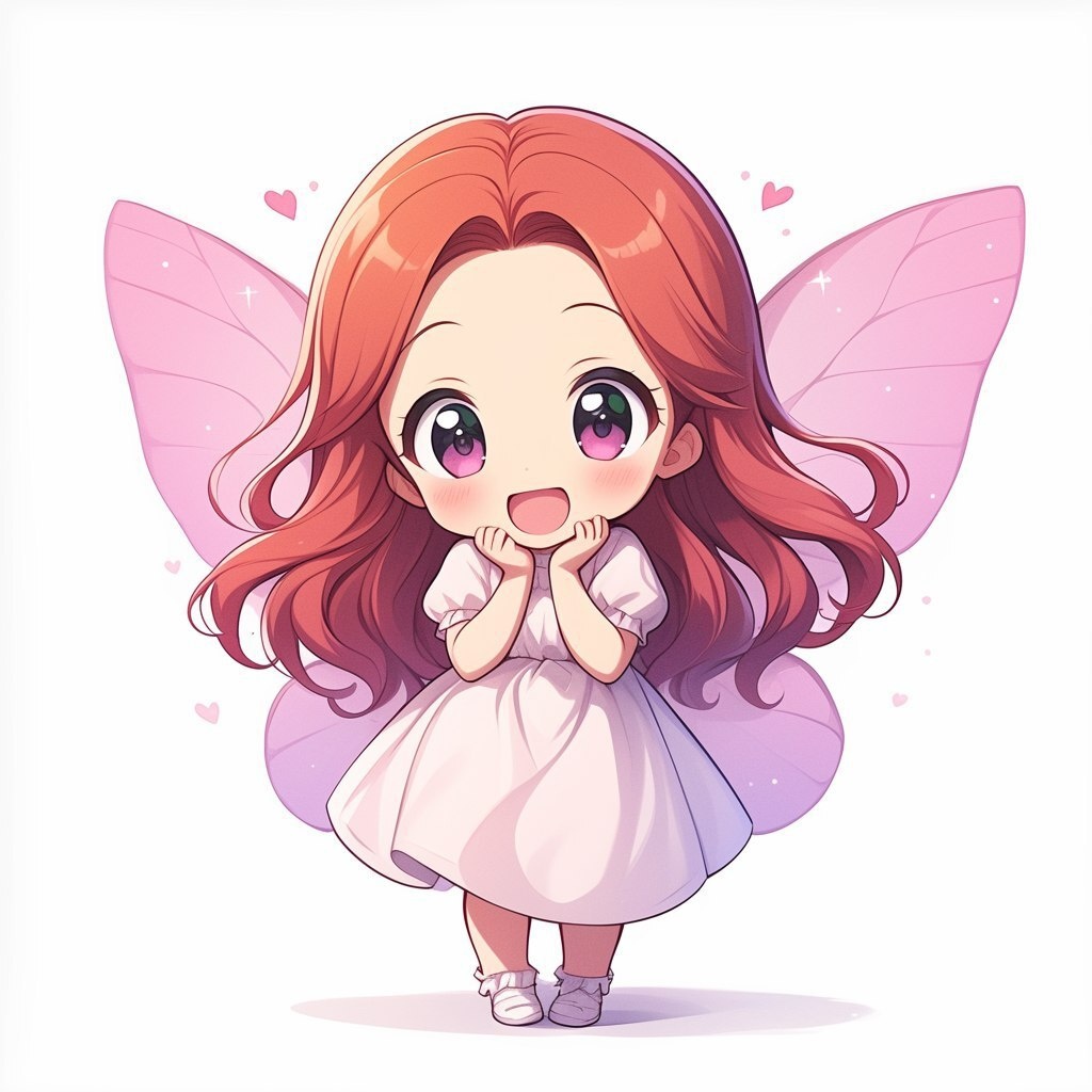 Создано на основе запроса: Fullbody fairy chibi girl stands with orange hair and pink eyes, dressed in a beautiful dress with crystals and sparkles, translucent wings