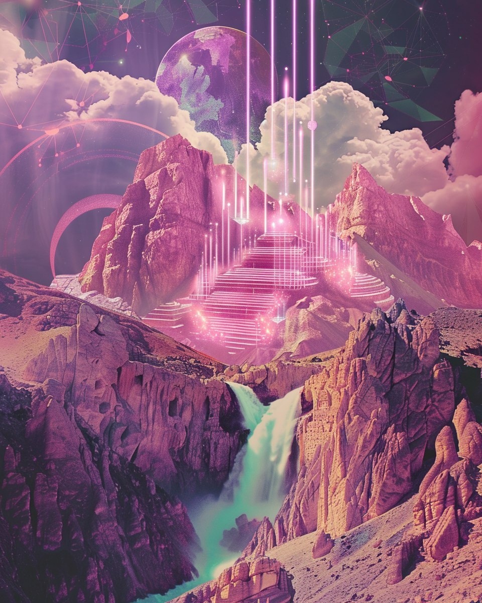 Создано на основе запроса: cosmic surreal collage with glowing mountain range, waterfall of stardust flowing into a sacred pool, floating ancient temple of light, pastel holographic clouds, Akashic geometry patterns in the sky, #01E8CF, #9800FF, #D400FF --- Автоперевод: Космический сюрреареалистический коллаж со светящейся горной цепью, водопад звездной точки, вступающий в священный бассейн, плавающий древний храм света, пастельные голографические облака, схемы геометрии акаши в небе, #01E8CF, #9800FF, #D400ffffff Какое твое мнение? 🤔 https://dzen.ru/id/65c0c65c86e4f837c27b24d7 #ИИ #AI #нейросеть #midjourney #art