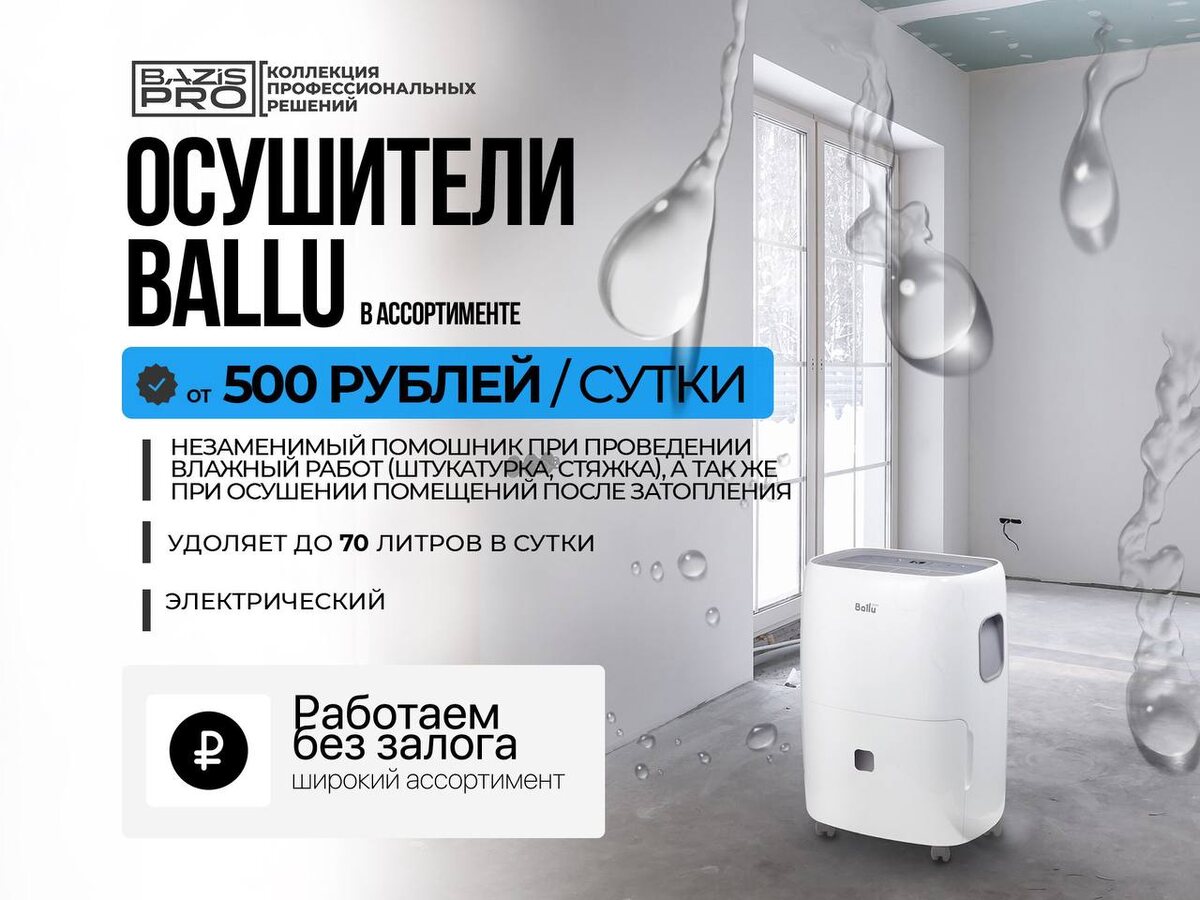 Ни верьте никому, что за 1-2 дня осушитель справится с сыростью! Дом 100м2 после строительства сушится в среднем 1-1.5 месяца и собирает до 3 тонн воды. Просто за неделю влажность упадет с 90% до 89%, а должна быть ниже 50% для начала ремонтных работ согласно СНиП. Именно поэтому осушитель воздуха Ваllu 70 является незаменимым устройством перед проведением ремонтных работ. Во время строительства, а так же во время проведения ремонта всегда возникают «мокрые» виды работ, такие как: штукатурные, стяжка полов, кладка стен, из-за которых в помещении появляется лишняя влажность и по технологии, проведение отделочных работ при повышенной влажности категорически запрещено. Осушитель воздуха помогает справиться с этой проблемой. ✔️ Осушитель BALLU 30 от 300 рублей/cутки ( Неделя 2100 рублей) ✔️ Осушитель BALLU 70 от 500 рублей/cутки ( Неделя 3500 рублей) Больше инструмента на нашем сайте www.bazispro.pro Тел.: 8 999 400 19 24