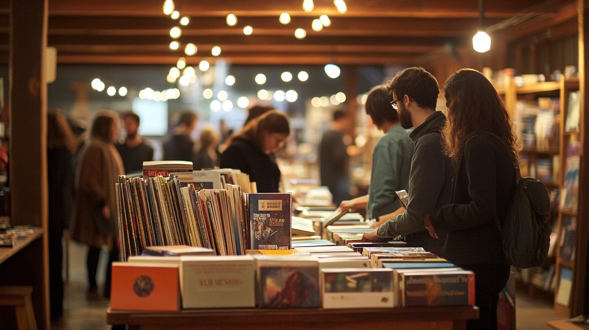 Создано на основе запроса: book fair, indoor event, tables with books, people browsing, cozy lighting, casual atmosphere