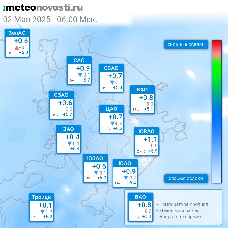 В 6:00 в Москве было от +0.2°C до +1.2°C, средняя температура +0.7°C #погода #Москва #весна #температура #2мая #пятница