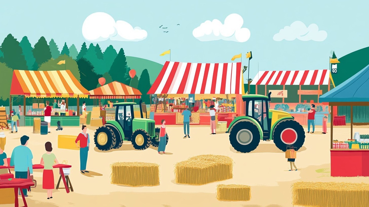 Создано на основе запроса: flat vector of agricultural fair, tractors, stalls, people, hay bales, colorful and clean