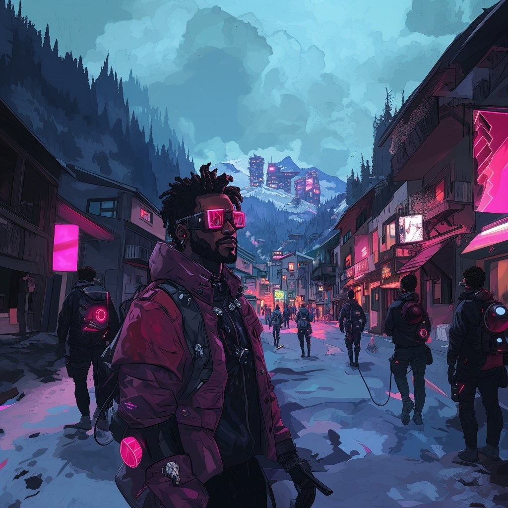 Создано на основе запроса: cyberpunk black man in dark art style in a mountain town with friends