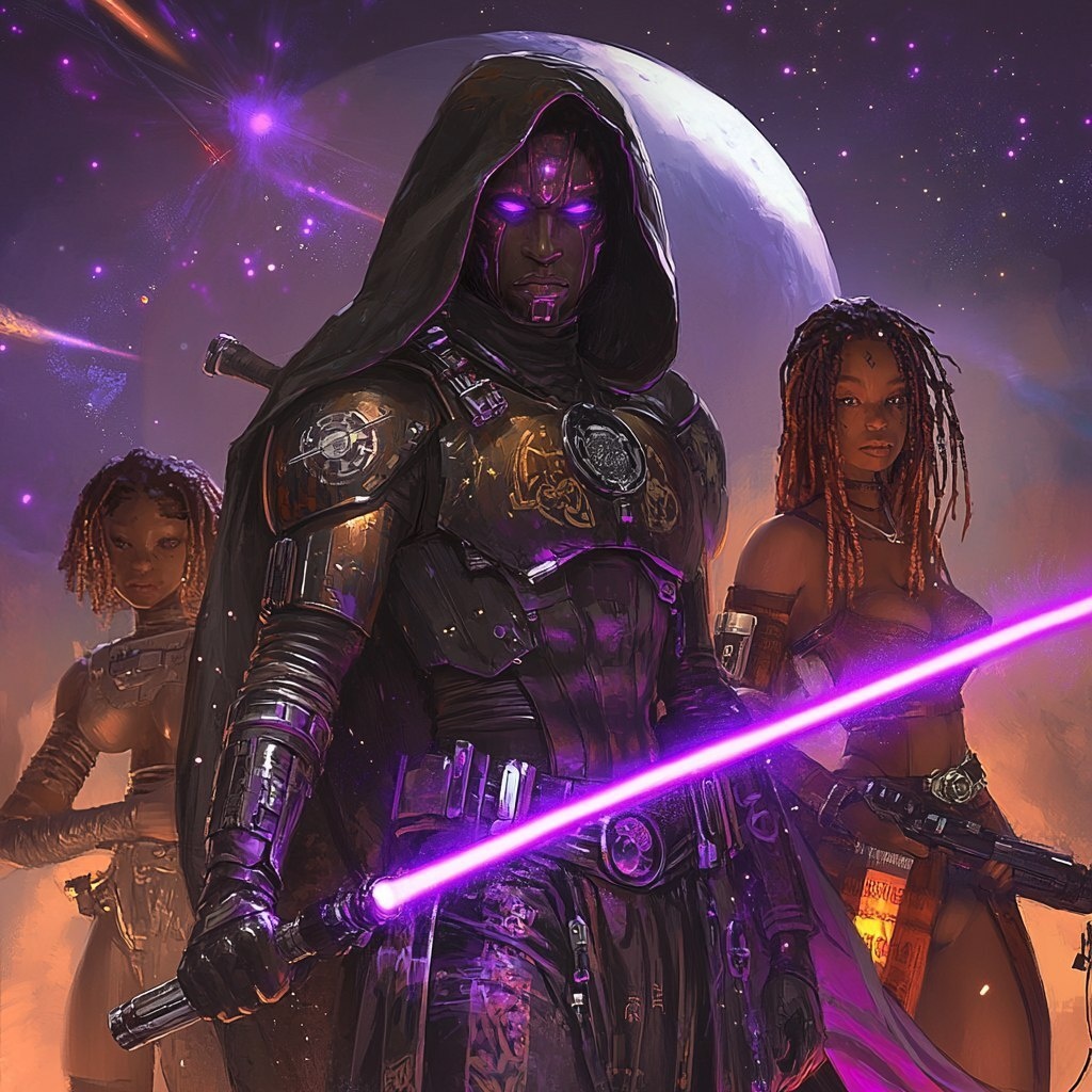Создано на основе запроса: Design a brown-skinned man as a Sith Lord inspired by Darth Revan, featuring ancient Kushite designs in his costume. He stands menacingly with a purple lightsaber, flanked by two young brown-skinned female apprentices in dynamic poses. In the background, include a beautiful brown-skinned woman with dreadlocks, casting a watchful shadow over the man and the apprentices. The scene should blend elements of Cowboy Bebop artistic style with intricate armor details, set against a cosmic backdrop of stars and distant planets to emphasize the sci-fi atmosphere." --- Автоперевод: Проектируйте коричневый человек как лорд Ситх, вдохновленный Дартом Реваном, в котором в его костюме представлены древние кушитские дизайны. Как тебе такая иллюстрация? 🤔 https://dzen.ru/id/65c0c65c86e4f837c27b24d7 #ИИ #AI #нейросеть #midjourney #art