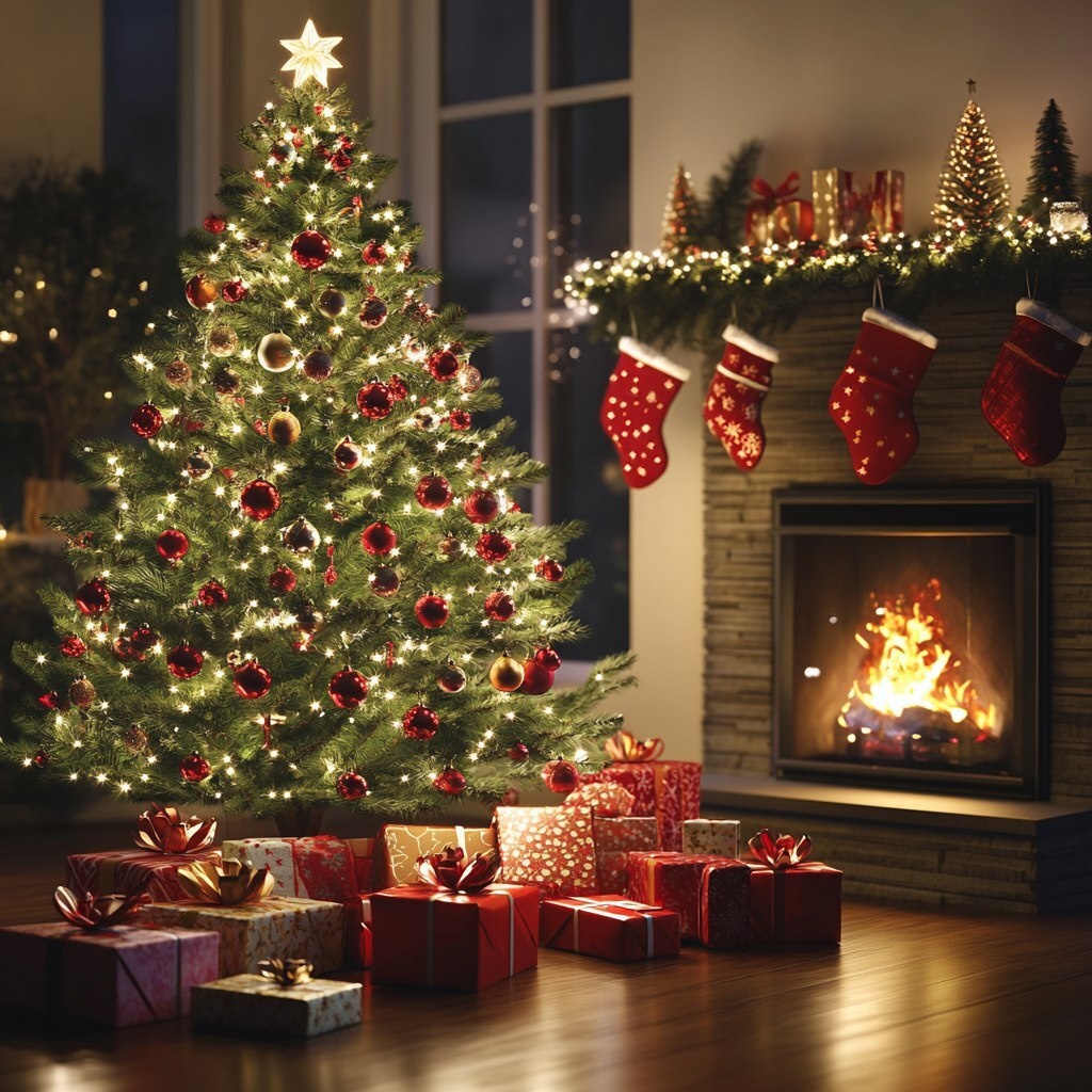 Создано на основе запроса: Positive Prompt:** A beautifully decorated Christmas tree adorned with glowing warm-white fairy lights, red and gold ornaments, standing in a cozy living room next to a crackling fireplace. Wrapped presents are scattered underneath the tree. The atmosphere is warm, festive, and inviting, with soft ambient lighting and a cozy holiday feel. Realistic style with a touch of holiday magic, detailed textures. 8K ultra-high resolution, intricate details on ornaments and pine needles, vibrant festive colors, sharp focus, cinematic quality lighting, bokeh effect from