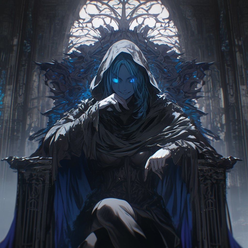Создано на основе запроса: The image is a cinematic panoramic view, hooded woman on a throne, no visible face, scary smile, glowing blue eyes, cape, black stone room, dark horror atmosphere, darkest cave, animé --- Автоперевод: Изображение представляет собой кинематографический панорамный вид, женщина с капюшоном на троне, без видимого лица, страшная улыбка, светящиеся голубые глаза, накидка, черная каменная комната, темная атмосфера ужасов, самая темная пещера, аниме Как тебе такая иллюстрация? 🤔 https://dzen.ru/id/65c0c65c86e4f837c27b24d7 #ИИ #AI #нейросеть #midjourney #art