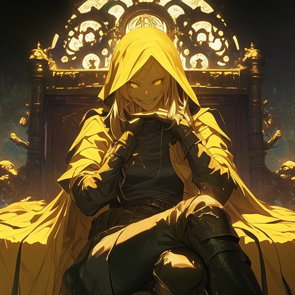 Создано на основе запроса: hooded woman on a throne, no visible face, scary smile, glowing yellow eyes, legs crossed, cape, dark horror