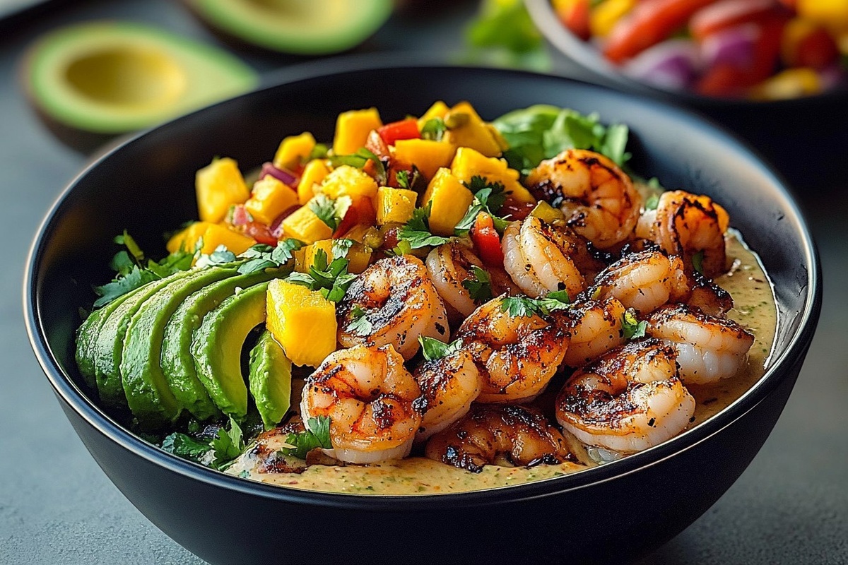 Создано на основе запроса: | Title: Shrimp and Avocado Bowls with Mango Salsa & Lime-Chili Sauce | STYLE: Close-up Shot right view