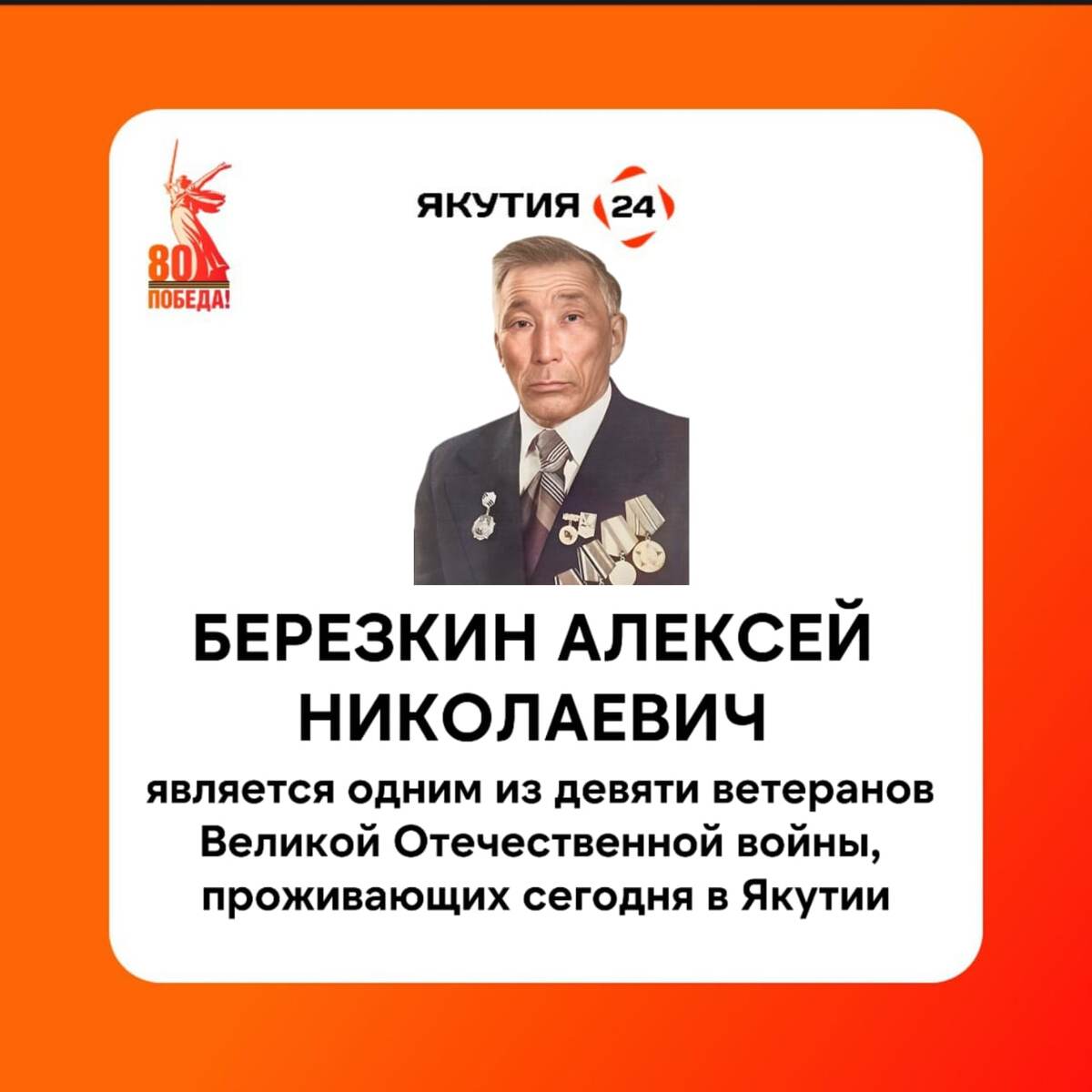 В ответ на пост ⭐ Путь к Победе: 80 фактов о Великой Отечественной войне Факт №74: На сегодняшний день в Якутии проживают девять участников Великой Отечественной войны. Один из них — Березкин Алексей Николаевич. Алексей Березкин родился 10 апреля 1923 года в Мегино-Кангаласском районе. Был призван 1 сентября 1941 года Чурапчинским районным военкоматом. С мая по август 1943 года служил в составе 368-го запасного стрелкового полка автоматчиком. С августа 1943 года по август 1946 года в составе 2-го Дальневосточного фронта 368-го особого горно-стрелкового полка разведчиком. С августа 1946 года по март 1947 года в 90-м отдельном артиллерийском батальоне служил старшим пулеметчиком. Уволен из рядов Советской Армии 15 марта 1947 года. Воинское звание – ефрейтор. Награжден Орденом Отечественной войны II степени, медалями «За победу над Японией», «За победу над Германией», «За доблестный труд в Великой Отечественной войне 1941-1945 гг». Алексей Николаевич Березкин награжден благодарностью