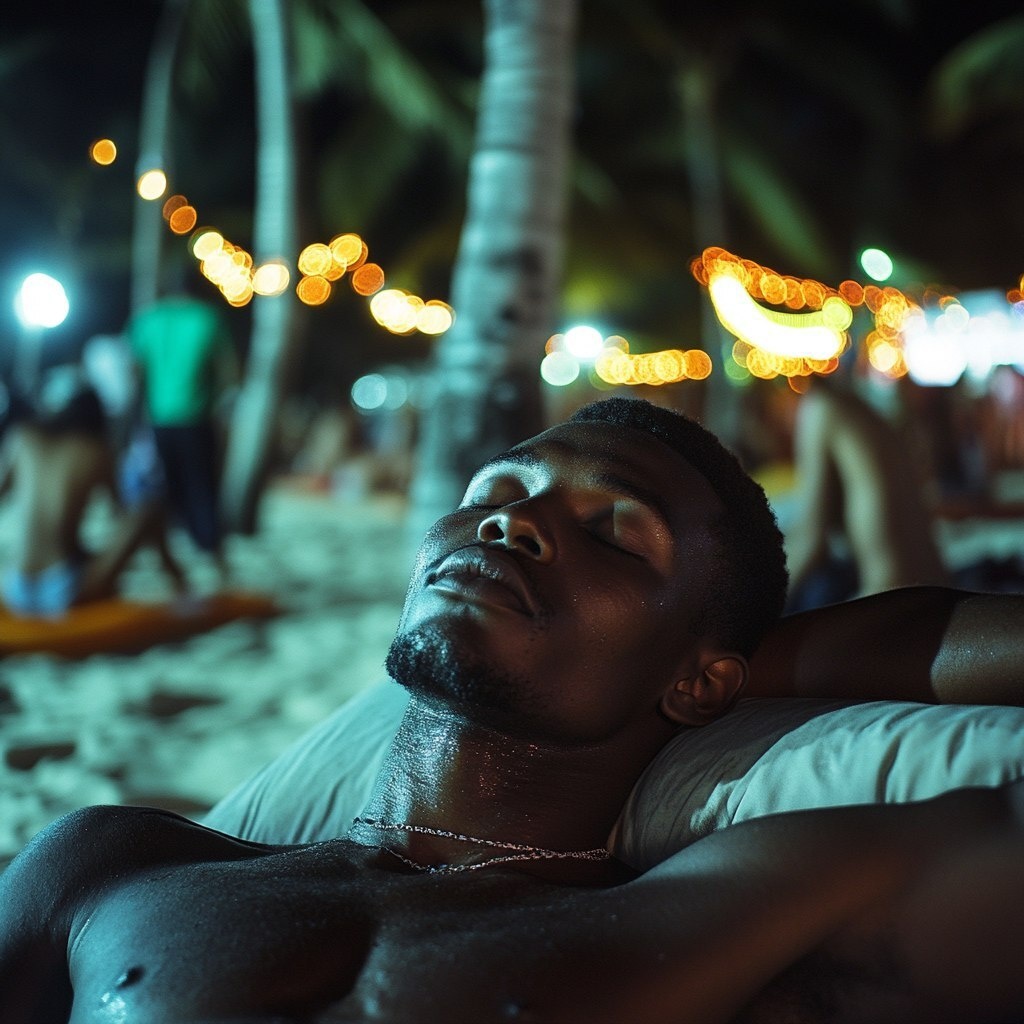 Создано на основе запроса: black 29 year old clean shaven short hair man dozing off at the beach at night on an island filled with people