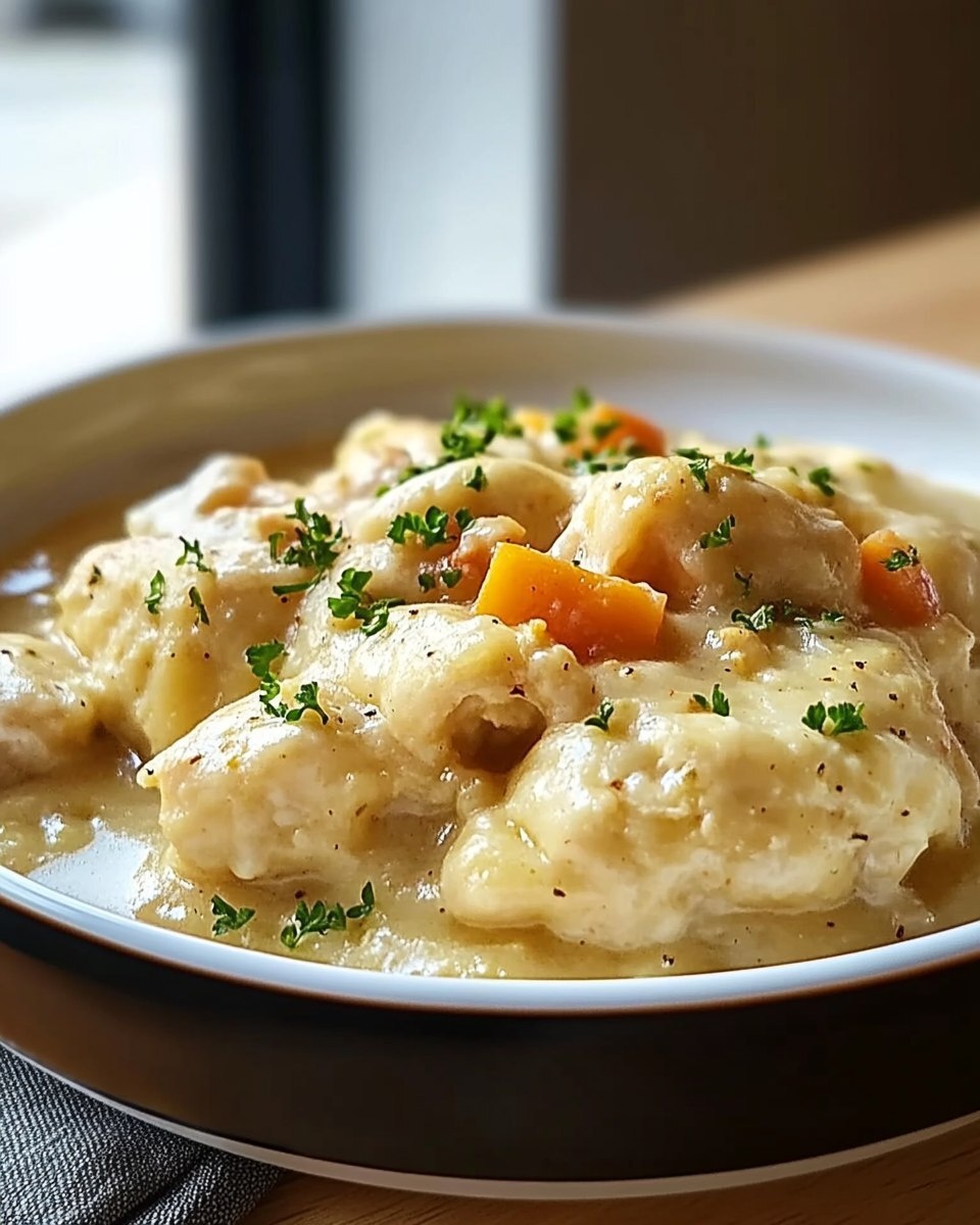 Создано на основе запроса: | Title: Crockpot Chicken and Dumplings | Close-up Shot right view, taken by a photographer with a high quality