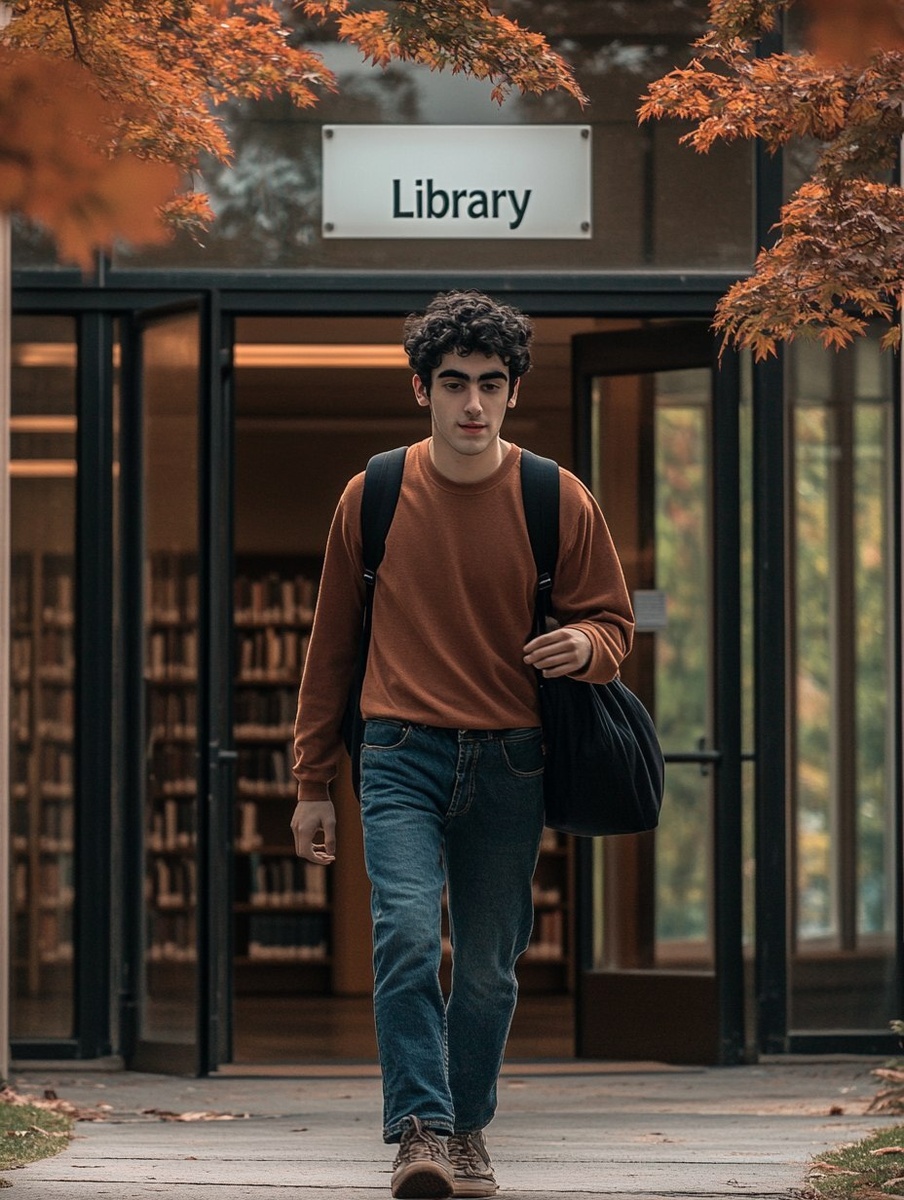 Создано на основе запроса: a photograph of a nineteen year old college student wearing jeans and a long sleeve shirt walking out of his