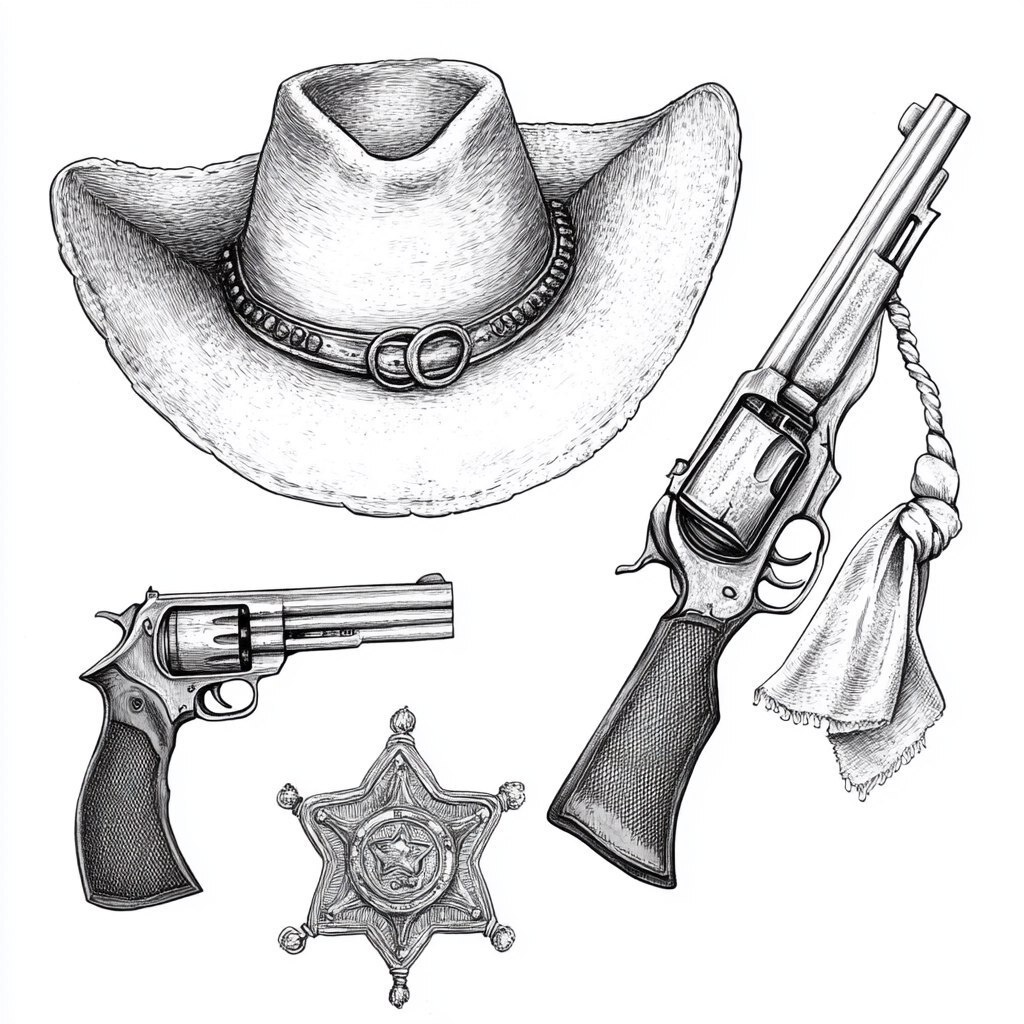 Создано на основе запроса: comic book illustration of cowboy gear. knolling cowboy gear: bandolero, pistols, sheriff badge, kerchief. vary line weights. high contrast. include white background. --- Автоперевод: Комикс иллюстрация ковбойского снаряжения. Какое твое впечатление? 🤔 https://dzen.ru/id/65c0c65c86e4f837c27b24d7 #ИИ #AI #нейросеть #midjourney #art