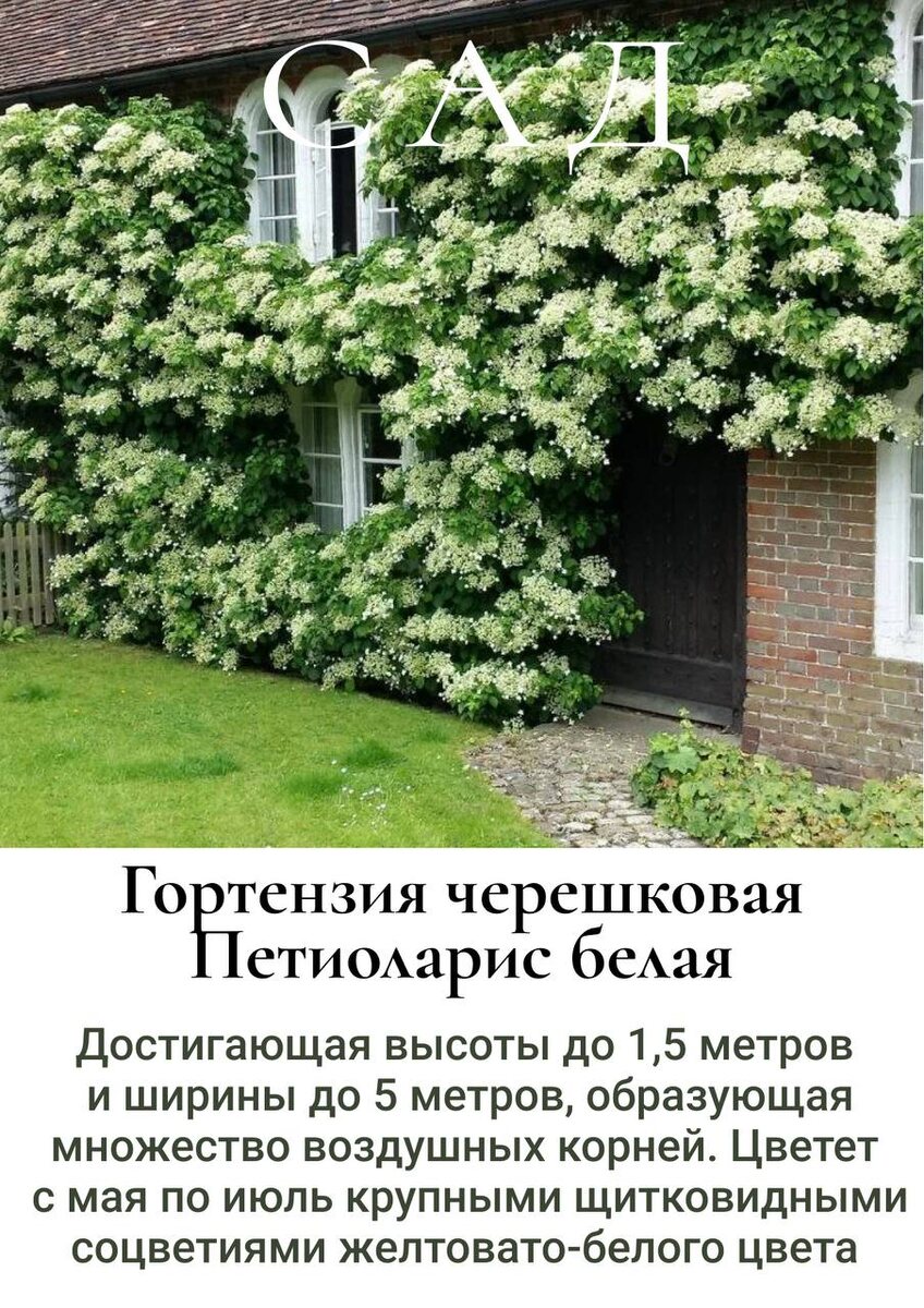 Гортензия–лиана: как такое возможно? Встречаете эксклюзивную гортензию черешковую «Петиоларис белая». Это удивительное растение станет настоящим украшением вашего сада! «Петиоларис белая» обладает прекрасными декоративными качествами: ● высота до 25 метров (в культуре до 8 метров); ● тёмно-зелёные листья длиной около 8 см, широкие и округло-заострённые; ● соцветия рыхлые, щитковидные, диаметром около 20 см; ● цветки медоносны, белые с розовыми краями; ● обильное цветение в течение месяца с конца июля; ● морозостойкость и теневыносливость. «Петиоларис белая» идеально подходит для вертикального озеленения, украшения стен, заборов, беседок и создания живых изгородей. Не упустите возможность добавить в свой сад эту прекрасную гортензию! В наличии всего 5 шт уже доступна к брони — https://cadkms.ru/decorativebush
