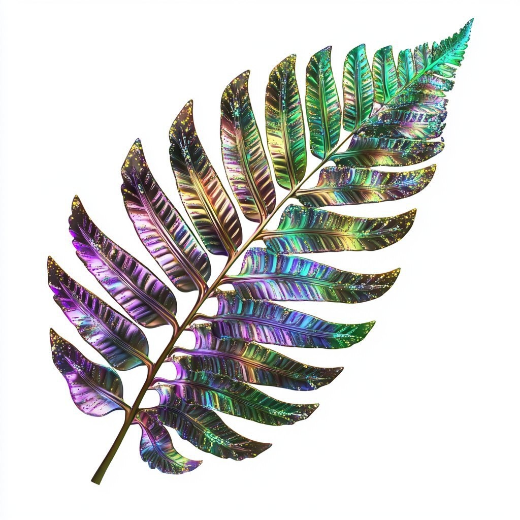 Создано на основе запроса: Lush, enchanted fern frond, photorealistic, with iridescent accents and subtle glitter glow in cosmic colors