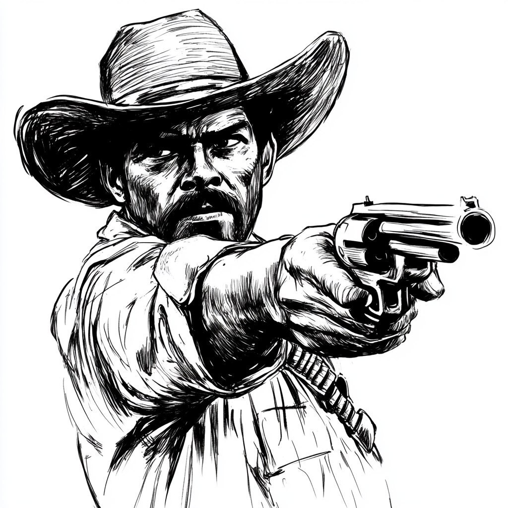 Создано на основе запроса: Spaghetti Western storyboard illustration of a Mexican gun fighter. vary line weights. hollywood western movies, 1960s. high contrast. include white background.