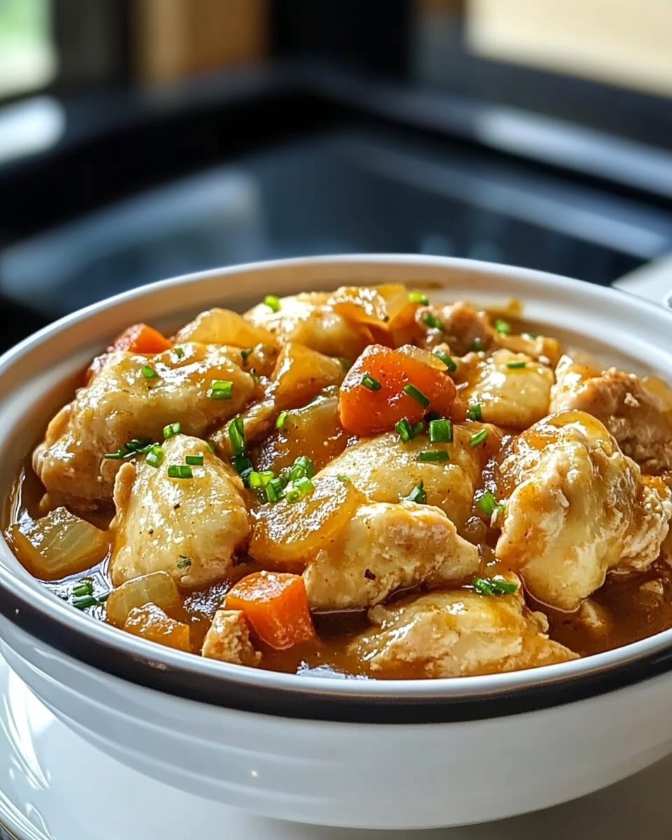 Создано на основе запроса: | Title: Crockpot Chicken and Dumplings | Close-up Shot right view, taken by a photographer with a high quality