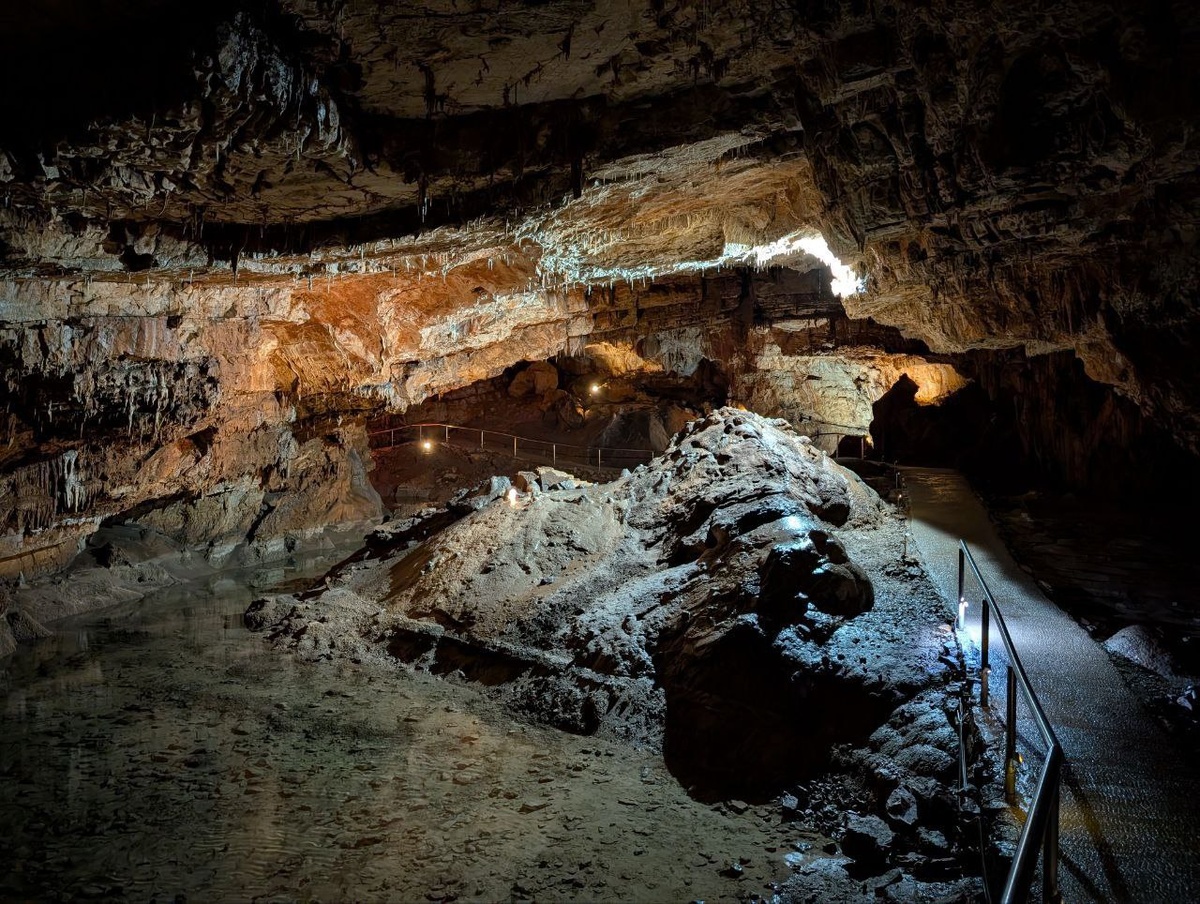 Пещера Ветренница. Босния и Герцеговина. 24.04.2025 Самая большая пещера Боснии и Герцеговины, возрастом около 5 млн лет, до сих пор не исследована полностью. Здесь всегда дует ветер. Зимой внутрь пещеры, а в жару наружу, и чем выше температура снаружи, тем сильнее поток воздуха - до 15 метров в секунду. Рассказывает Саша: "Пока доехал до пещеры, пошел дождь. Но в пещере то его нет! Пошел покупать билет. Нет никого. Постучал, позвал. Не отзываются. Пещера рядом, открыта. Ну я и пошел ) Иду смотрю, фотографирую. Никого. Потом слышу голоса - все-таки я здесь не один. Попались навстречу пару немцев, из моего "знания" немецкого понял, что они удивляются между собой, как я так пробрался в пещеру без каски. Иду дальше. Навстречу уже группа с экскурсоводом. Он уже не между собой, а мне напрямую заявил, что без каски здесь нельзя и опасно. Пошел с группой на выход, параллельно слушая рассказы экскурсовода. Вышел, решил, что мне пещеры достаточно (я довольно глубоко зашел), сел в маши