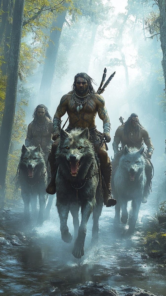 Создано на основе запроса: Savage warriors with animal pelts, glowing tattoos, riding giant wolves and sabertooth cats through a misty