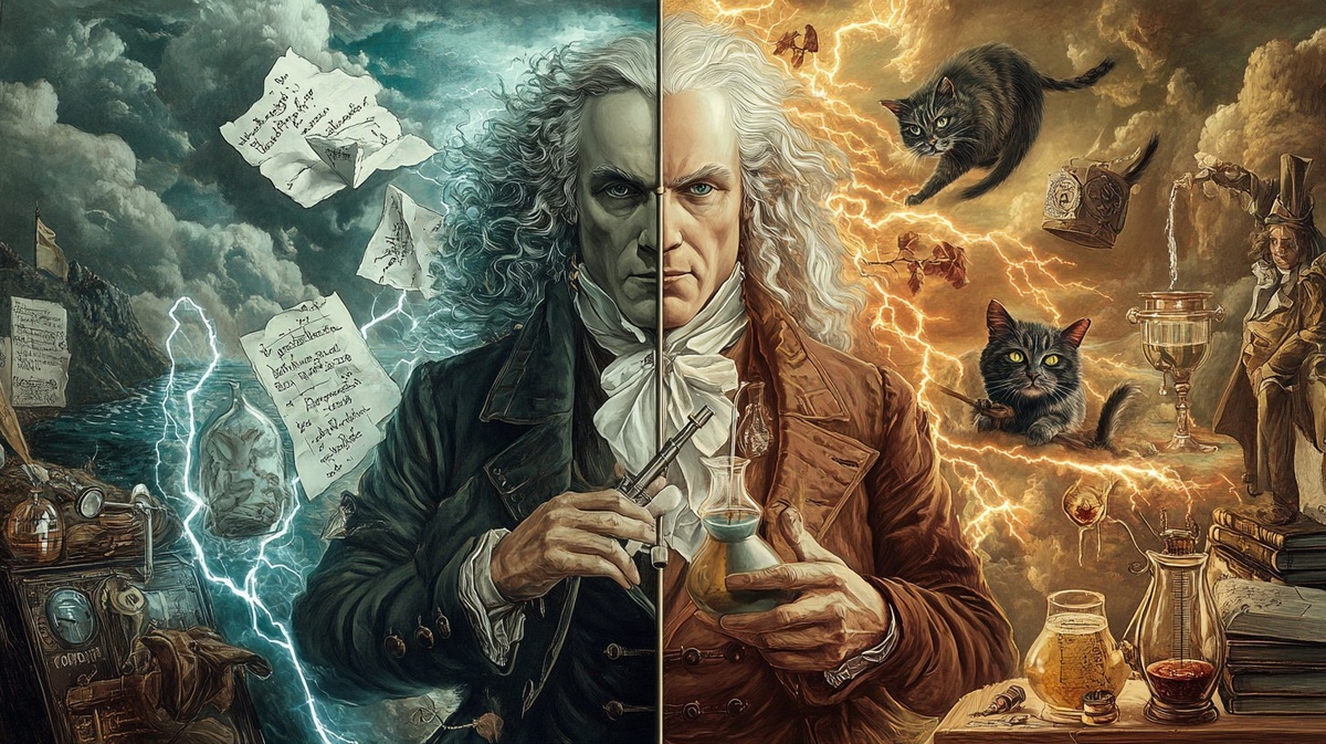 Создано на основе запроса: Isaac Newton split in two styles: one half as a dignified scientist with a telescope and math equations, the other half as a chaotic mad genius surrounded by alchemy, cats, and lightning, split composition, surreal historical illustration --- Автоперевод: Исаак Ньютон разделен в двух стилях: вдвое как достойный ученый с телескопом и математическими уравнениями, другая половина как хаотический безумный гений, окруженный алхимией, кошками и молнией, разделенная композиция, сюрреалистическая историческая иллюстрация Красиво выглядит? 🤔 https://dzen.ru/id/65c0c65c86e4f837c27b24d7 #ИИ #AI #нейросеть #midjourney #art