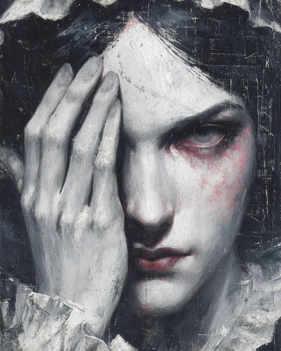 Создано на основе запроса: eerie painting with a color scheme of monochromatic black and white with a pop of Color