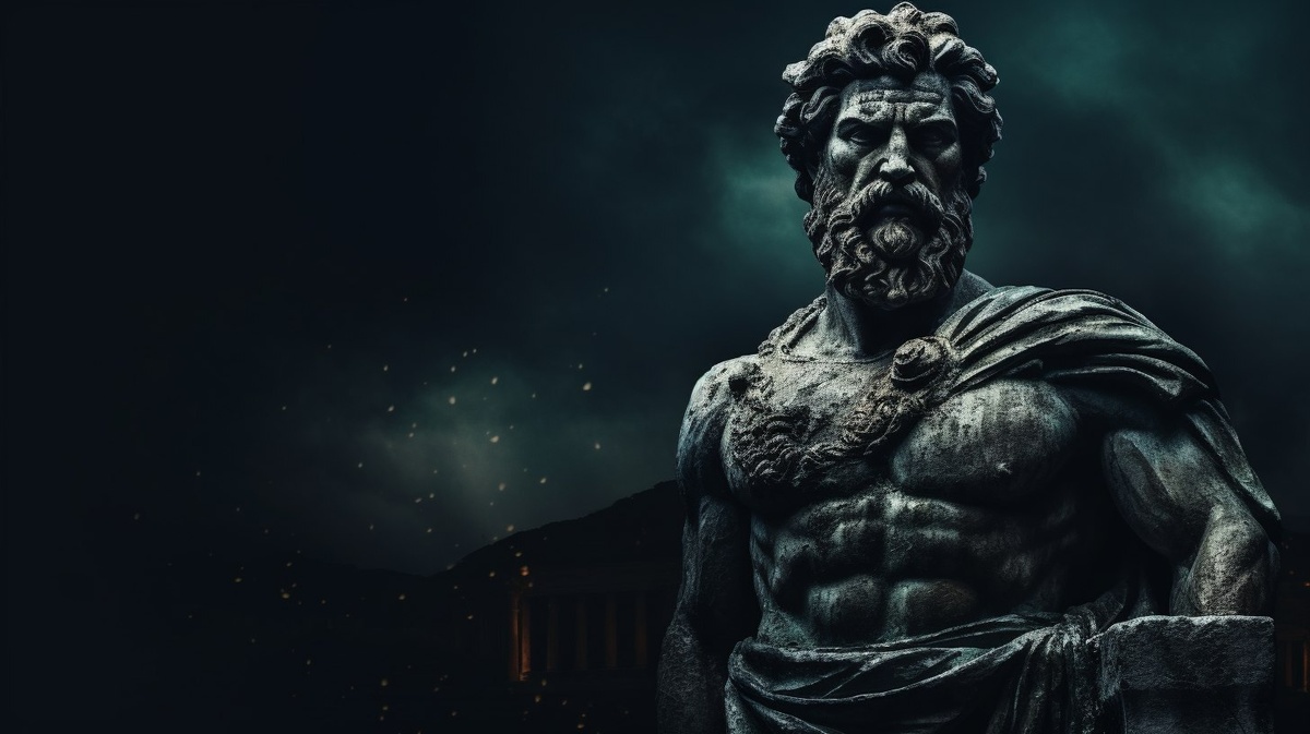 Создано на основе запроса: A strong stoic statue is with a semidark background of the city, close up shot with space for text