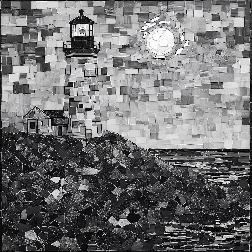 Создано на основе запроса: a black and white mosaic image of a lighthouse on the ocean