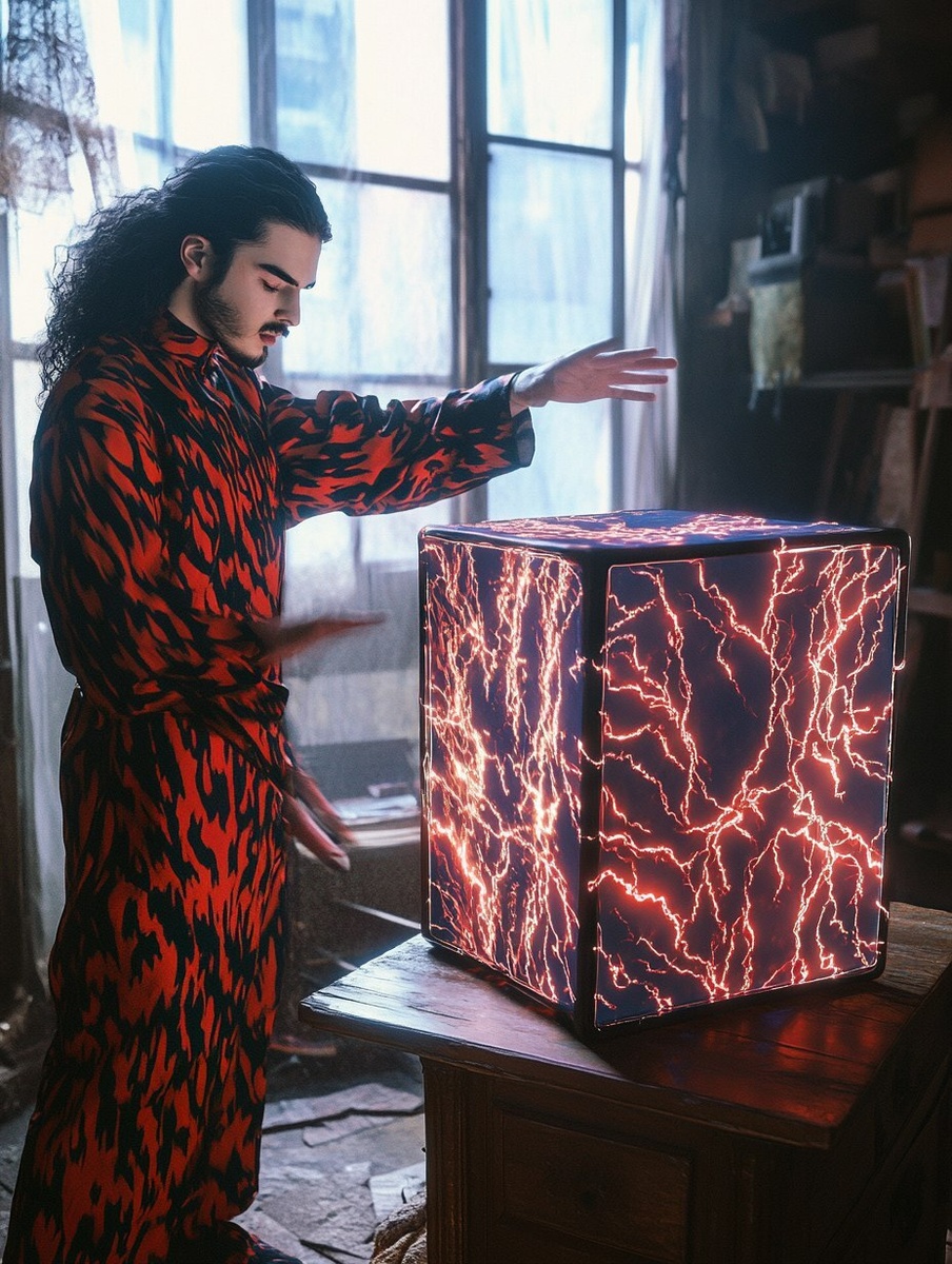 Создано на основе запроса: a photograph of a male mystic wearing shiny red and black patterned clothing standing to the left of a large magical cube standing diagonally on its pointed corner spinning like a top on top of an antique wooden table. The cube is purple, pink, and turquoise. On the surface of the cube, electrical currents move like lightening bolts across the surface. The mystic is holding his hands outward towards the cube as if he were controlling it. In the background is a messy apartment bedroom with large open windows. Sony A65 camera. --- Автоперевод: Фотография мужского мистика в блестящей красной и черной одежде с рисунком, стоящей слева от большого волшебного куба, стоящего по диагонали на его остроконечном углу, вращающемся, как вершина на антикварном деревянном столе. Круто получилось? 🤔 https://dzen.ru/id/65c0c65c86e4f837c27b24d7 #ИИ #AI #нейросеть #midjourney #art