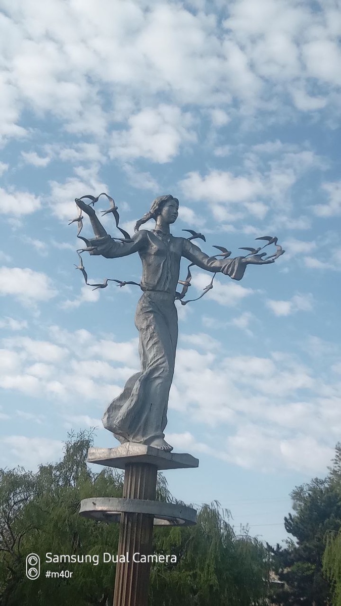 Фонтан и скульптура Чолпон (Венера?) в окружении ласточек -- Иссык-Куля. Чолпон-Ата, Иссык-Куль