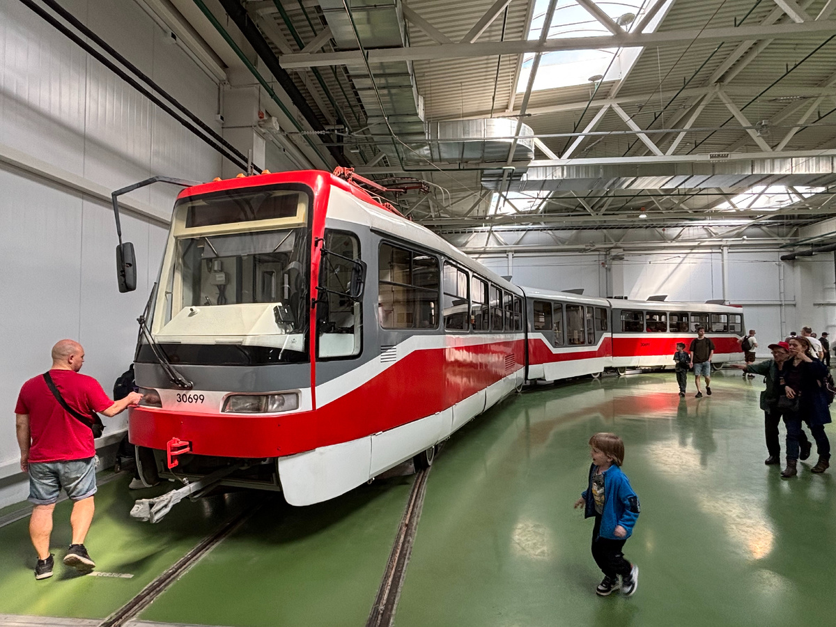Депо встречает гулкой какофонией — гудки ретровагонов, смех, гитарные аккорды. Ворота распахнуты, внутри — толчея. Люди облепили вагоны, как муравьи сахар: вот «Ф» с резными поручнями, словно из довоенного Ленинграда, грузовой трамвай с облупленной краской, техничка, похожая на гигантского жука. Дети тычут пальцами в стёкла, взрослые щёлкают фото. КТ3R, отреставрированный до блеска, кажется игрушечным — будто только с конвейера.