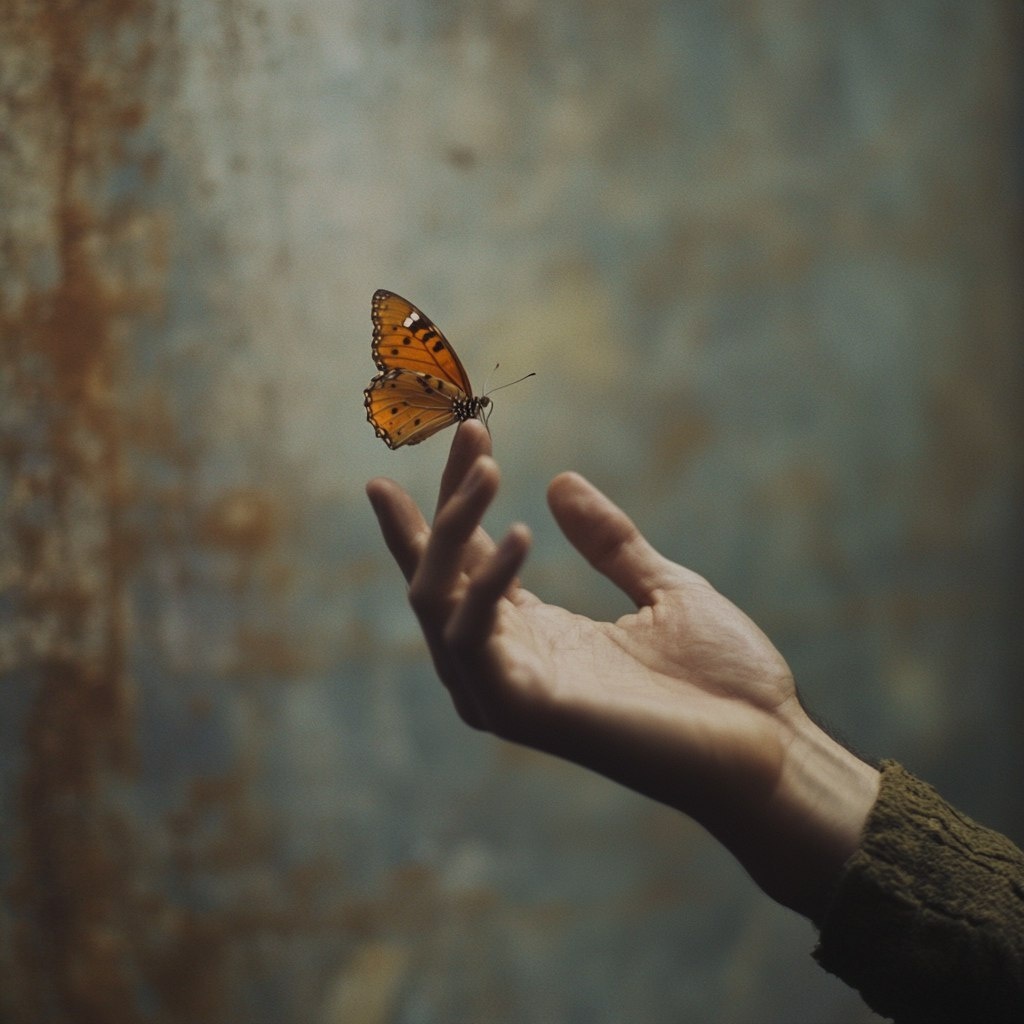 Создано на основе запроса: A raw, emotional image of a single woman arm extended upward, fingers reaching gently toward a butterfly that appears to be delicately landing on the tip of the index finger. The background is minimal or abstract, emphasizing the connection between human fragility and the beauty of nature. The scene should feel unpolished, organic, and slightly gritty a sense of vulnerability and hope captured in a raw visual aesthetic --- Автоперевод: Сырой, эмоциональный образ одной женщины -руки вытянулся вверх, пальцы мягко тянулись к бабочке, которая, по -видимому, деликатно приземляется на кончике указательного пальца. Что скажешь? 🤔 https://dzen.ru/id/65c0c65c86e4f837c27b24d7 #ИИ #AI #нейросеть #midjourney #art