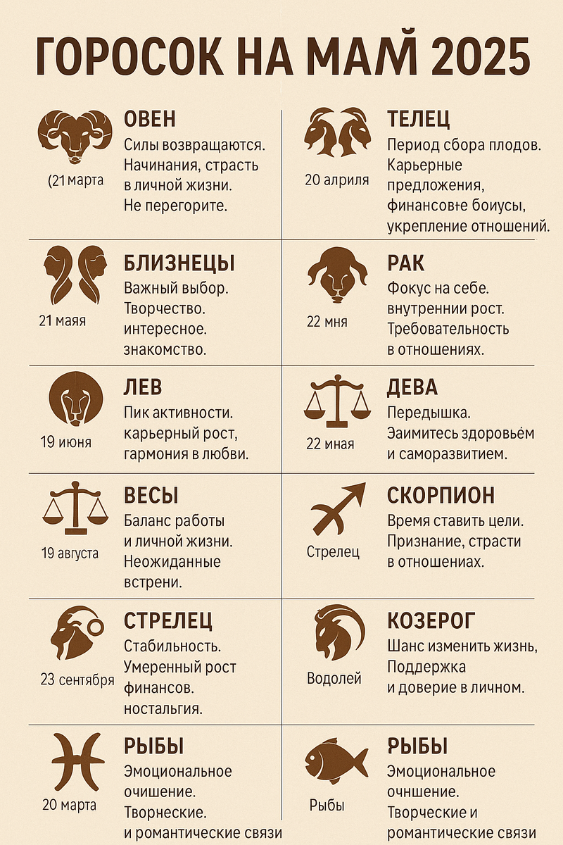 Май 2025 года обещает стать переломным месяцем для многих знаков зодиака. Энергия весны будет ощущаться в каждом шаге, но астрологи предупреждают — не стоит плыть по течению. Планеты призывают нас к действиям: решительным, но продуманным. Рассмотрим, что ждёт каждый знак зодиака в этом месяце. В мае ты будешь чувствовать, как силы возвращаются. Это отличное время, чтобы начать новое дело или вернуться к старой мечте. Финансы начнут стабилизироваться, но трать с умом. В личной жизни — страсть и неожиданности. Важно: не перегори — отдых тоже нужен. Это твой месяц, Телец. Время собирать плоды усилий последних месяцев. Особенно удачным будет период после 10 мая. Возможны карьерные предложения или финансовые бонусы. В любви — романтика и стабильность. Не упусти шанс укрепить важные отношения. Май заставит тебя сделать выбор. Будь внимателен к предложениям — среди них может оказаться судьбоносное. Финансовые риски стоит избегать. Зато для творчества и общения — идеальный период. Конец месяца