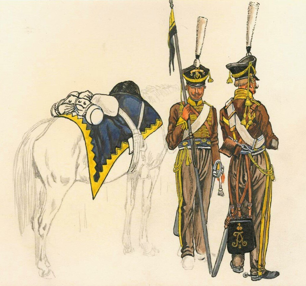 - Кивер: Высокий (около 20-25 см) цилиндрический головной убор из черного фетра или кожи с кожаными козырьком и задником. Украшался султаном (из перьев или конского волоса), репейком (кокардой) национальных цветов, гербом или арматурой из белого или желтого металла, и этишкетом – декоративным шнуром с кистями, обвивавшим кивер. Подбородный ремень имел металлическую чешую. Вне строя часто носили более легкую и удобную фуражную шапку (фуражку) – мягкую суконную шапку без козырька, тулья которой была цвета доломана, а околыш – цвета воротника, с выложенным шнурком номером эскадрона.