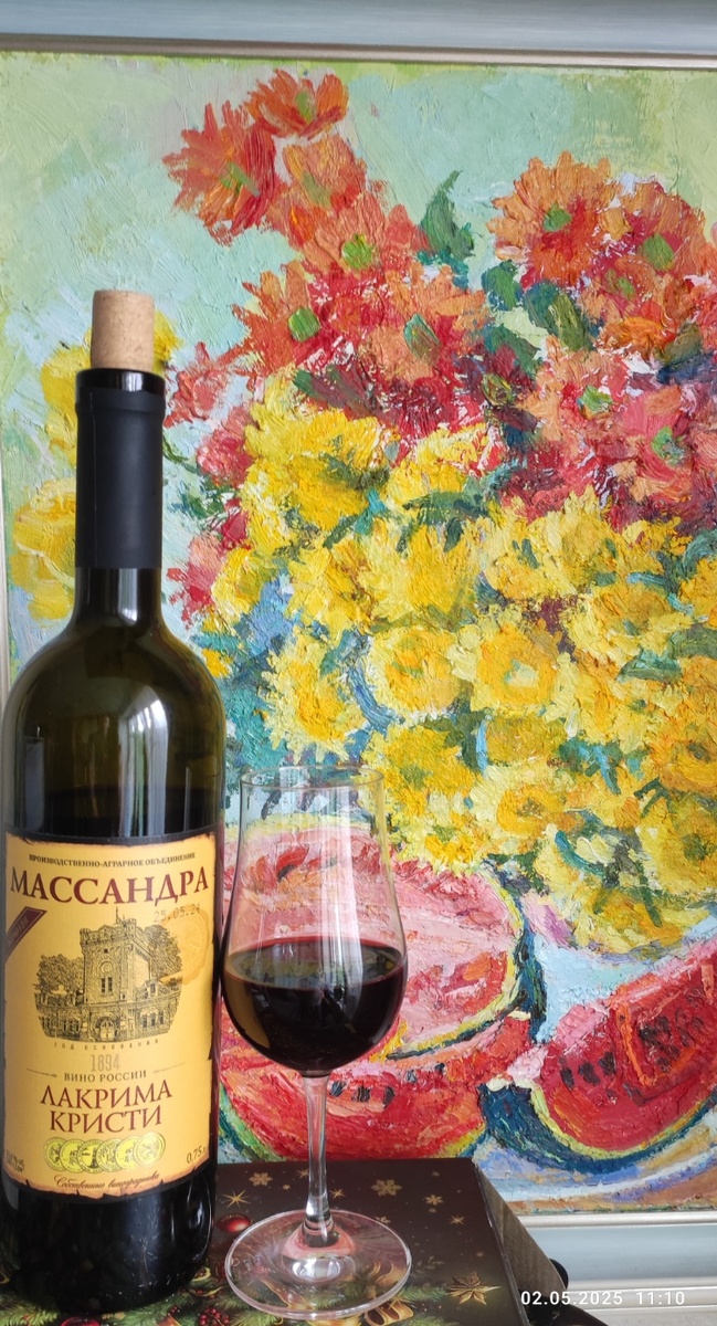 Всем привет от меня, КОньячного Маньяка и наших друзей! Вслед ушедшему Кагору открыл я на Первомай очередную Массандру. Отзывы на неё благоприятные, покупал аж в Москве, должна порадовать... Вино ликёрное с ЗГУ "Крым" марочное, десертное. Выдержано не менее двух лет. Состав: вино из винограда Алеатико, спирт ректификат Люкс., диоксид серы. Сахара в составе нет, при этом его содержание даже выше чем в кагоре- 180г\дм3, крепость 16%. Год урожая 2020, розлив 05.24. Цвет практически непрозрачный, как у смородинового варенья. Аромат мощный, уверенный, фруктово-ягодный. Смородина, ежевика, голубика, словом весь спектр ягод. Наяристо, приятно, вкусно! На взбалтывании радует ещё больше, раскрываясь и расцветая как цветочный бутон с новой силой и красками. Уверенные 8 баллов за аромат! Вкус чумовой и совершенно неуместной сладостью буквально убивает и все нажитое ароматом на корню, а заодно и желание пить вино. В процессе глотка буквально плакать хочется от явственного понимания того, как са